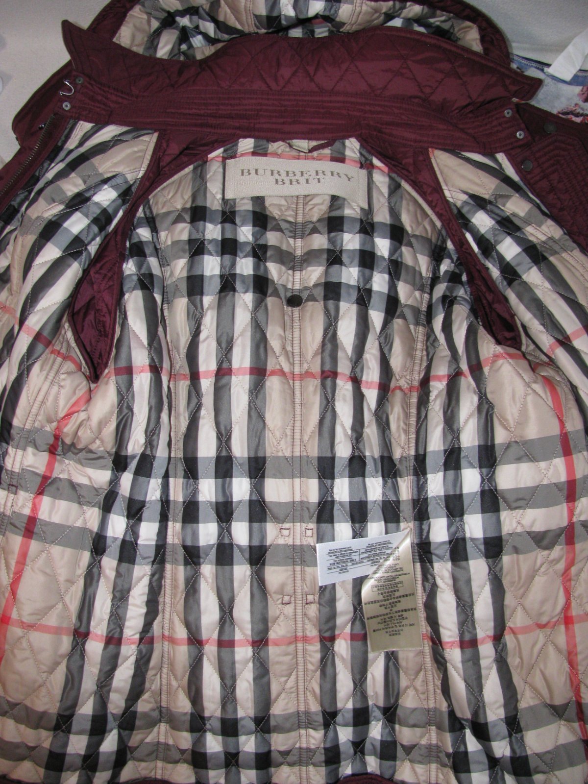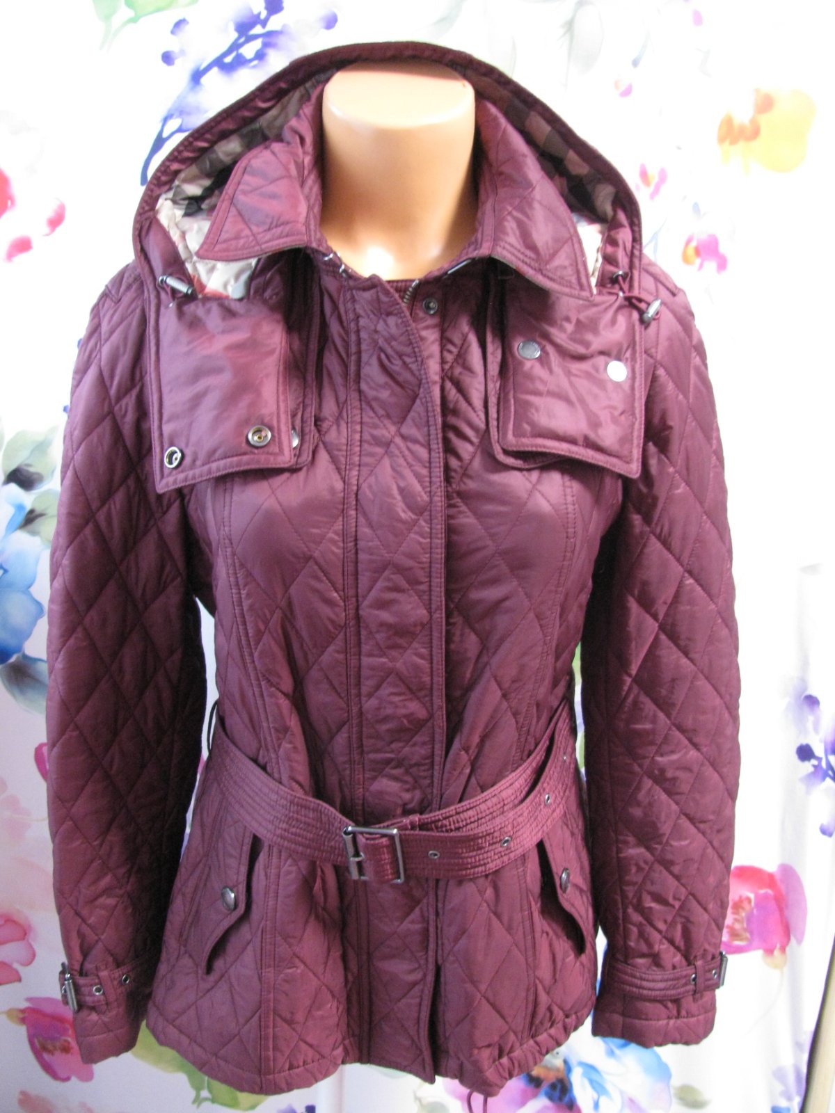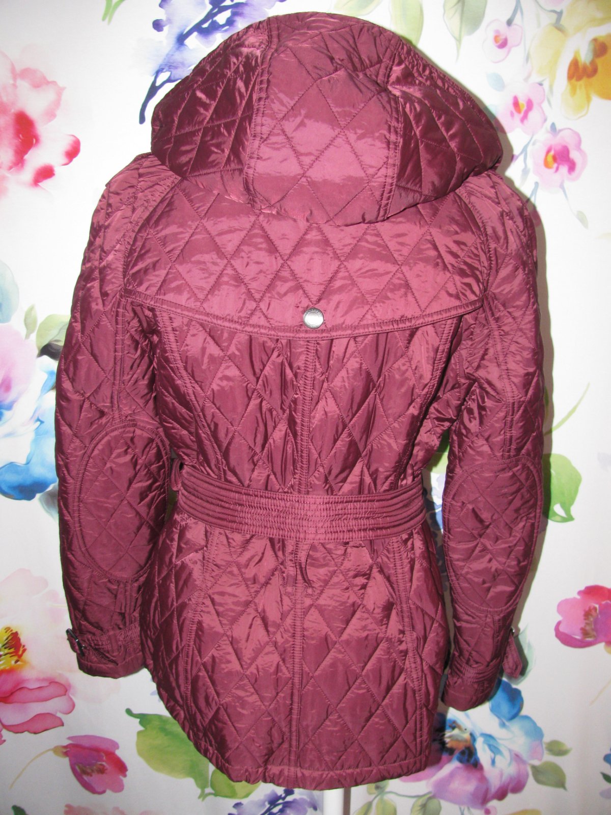Luxusní vínová prošívaná bunda s kapucí, barva je tlumenější - viz tmavší foto , kapuce je na odepnutí na zip, zap. bundy je na zip a druky, boční kapsy na druk, spodní lem s regulací, součástí je opasek, není nutno nosit. Bunda je nošená jen 2x, Tak je v top stavu , jako nová. 100% nylon, 100% polyester. PC velmi vysoká.