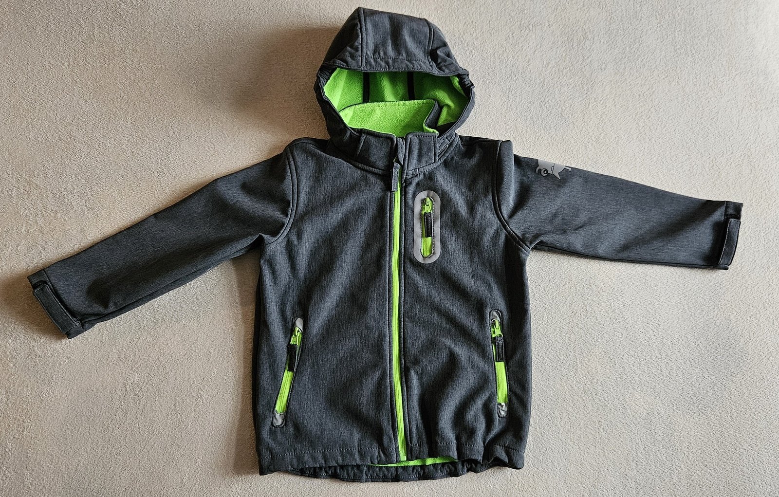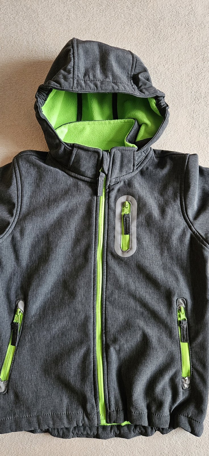 Prodám ve výborném stavu tmavě šedou softsheelovou bundu podšitou sytě zeleným hřejivým fleesem.