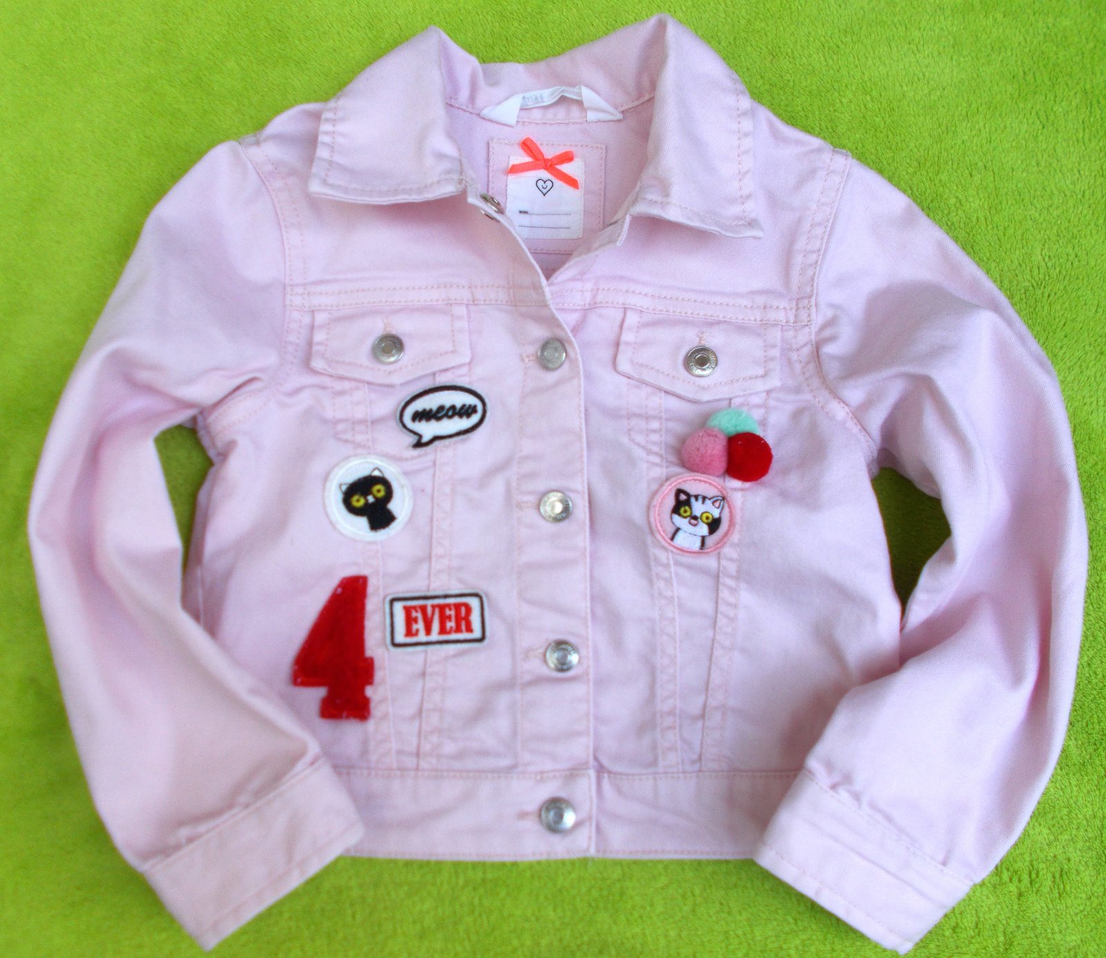 Krásná růžová riflová, džínová bunda - strečová, pružná, příjemná na nošneí. Zdobená nášivkami a bambulkami, zapínání na druky, dvě kapsičky.