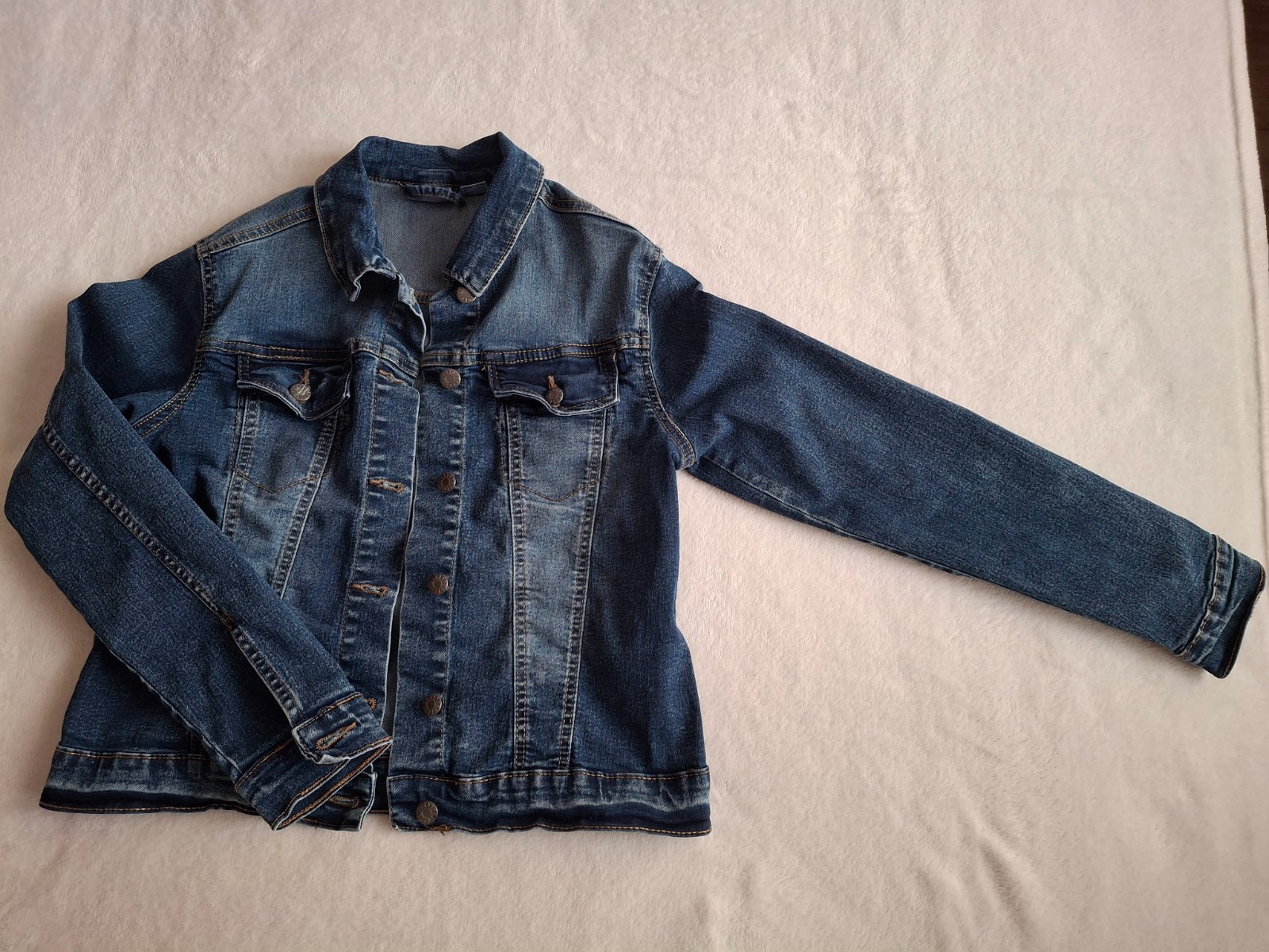 Nenošená tmavě modrá džínová bunda, vel. 152. Délka 47 cm, šířka 40 cm, délka rukávu od krku 63 cm. Materiál 80% bavlna, 18% polyester, 2% elastan.