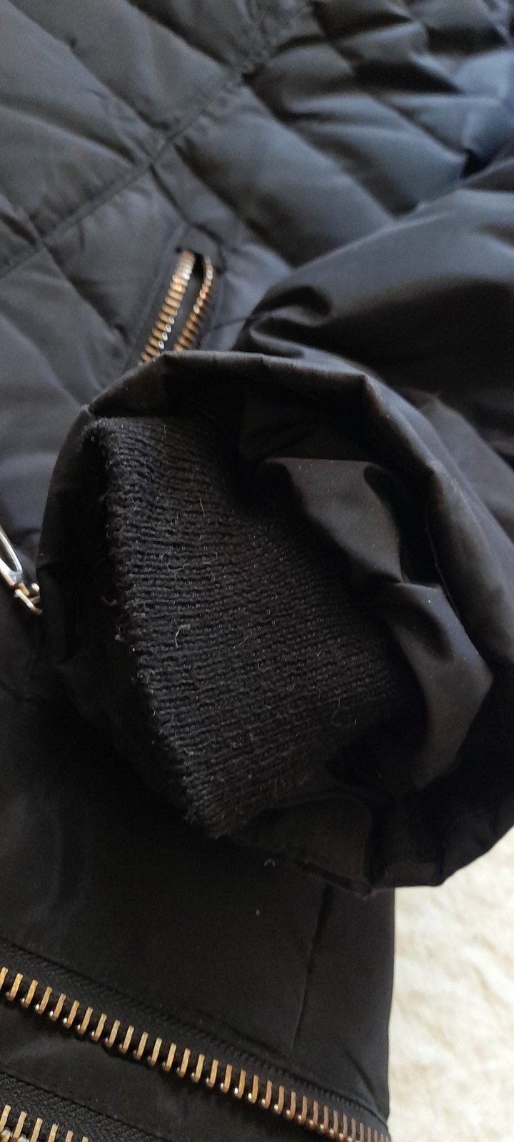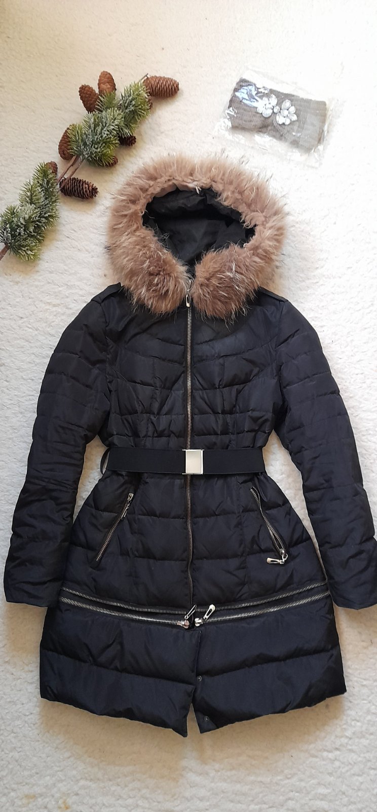 ✒ popis: ozdobné zipy, postranní kapsy se zipy, délku bundy lze regulovat pomocí odstranitelného spodního dílu na zip, na krátkou a delší variantu, kapuce s límcem a odepínací pravou kožešinou, vnitřní malá kapsa, rukávy s vnitřními úpletovými návleky, poutka na pásek a strečový pásek se sponou (je docela volný, kamarádka si ho utahovala zevnitř), vnější nepromokavý materiál, výplň z jemného peří