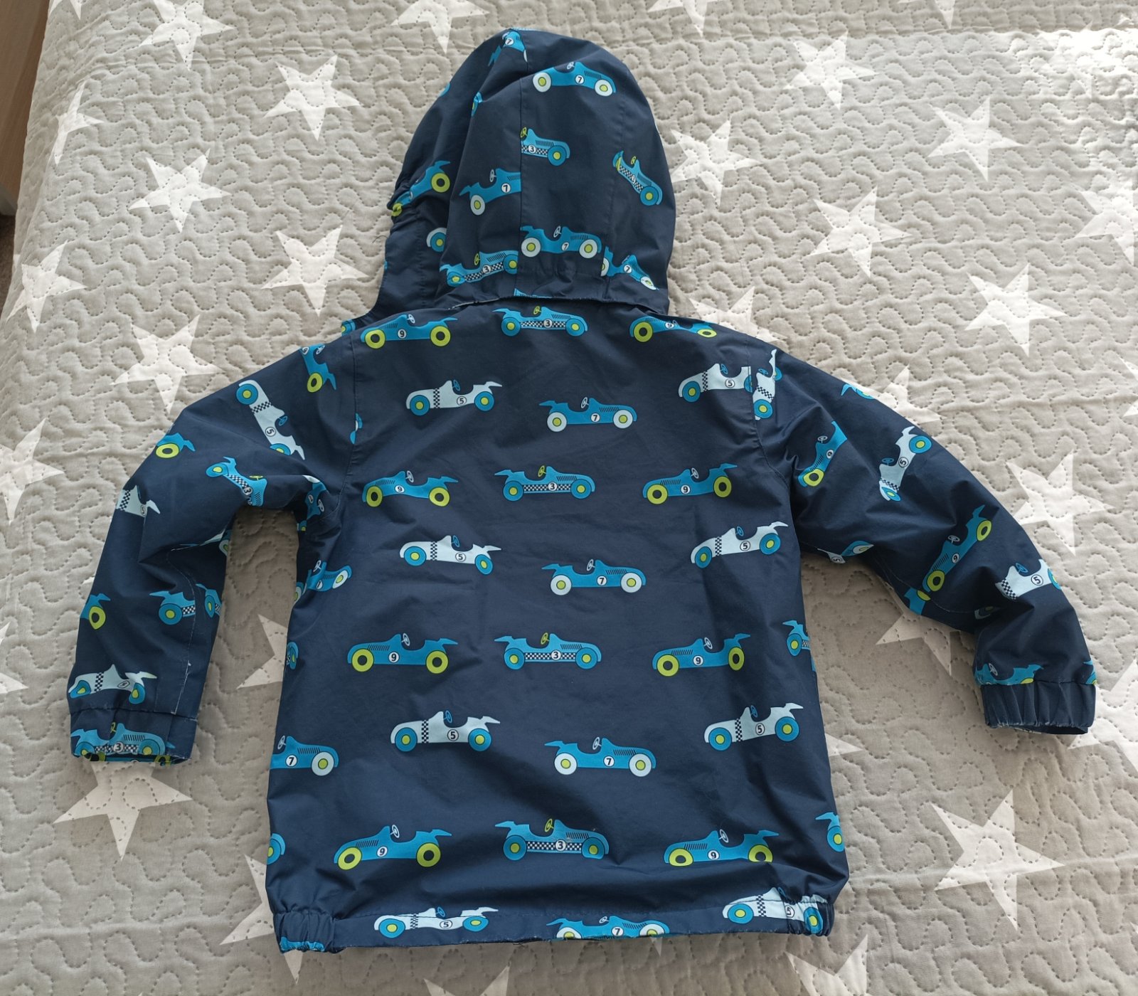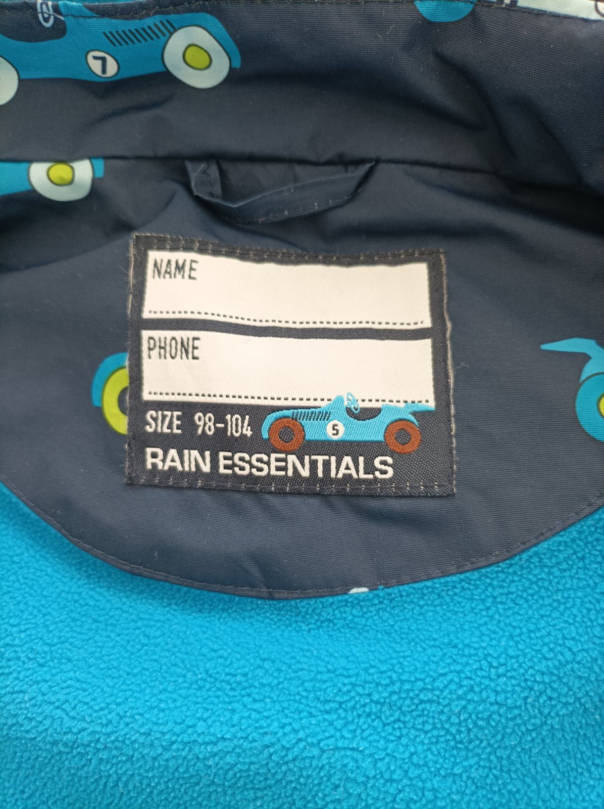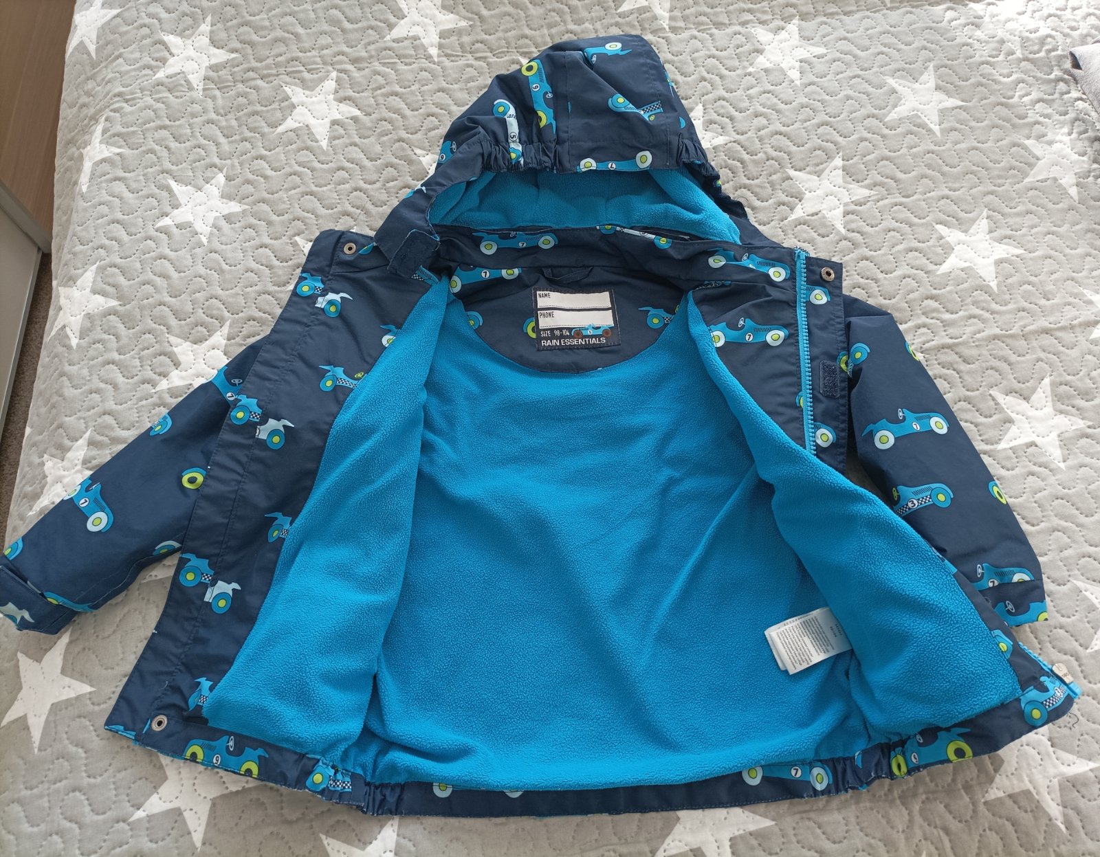 Nošená nepromokavá bunda zateplená fleecem. 2 kapsy, odepínací kapuce, stahování rukávů na suchý zip. Velikost 98/104