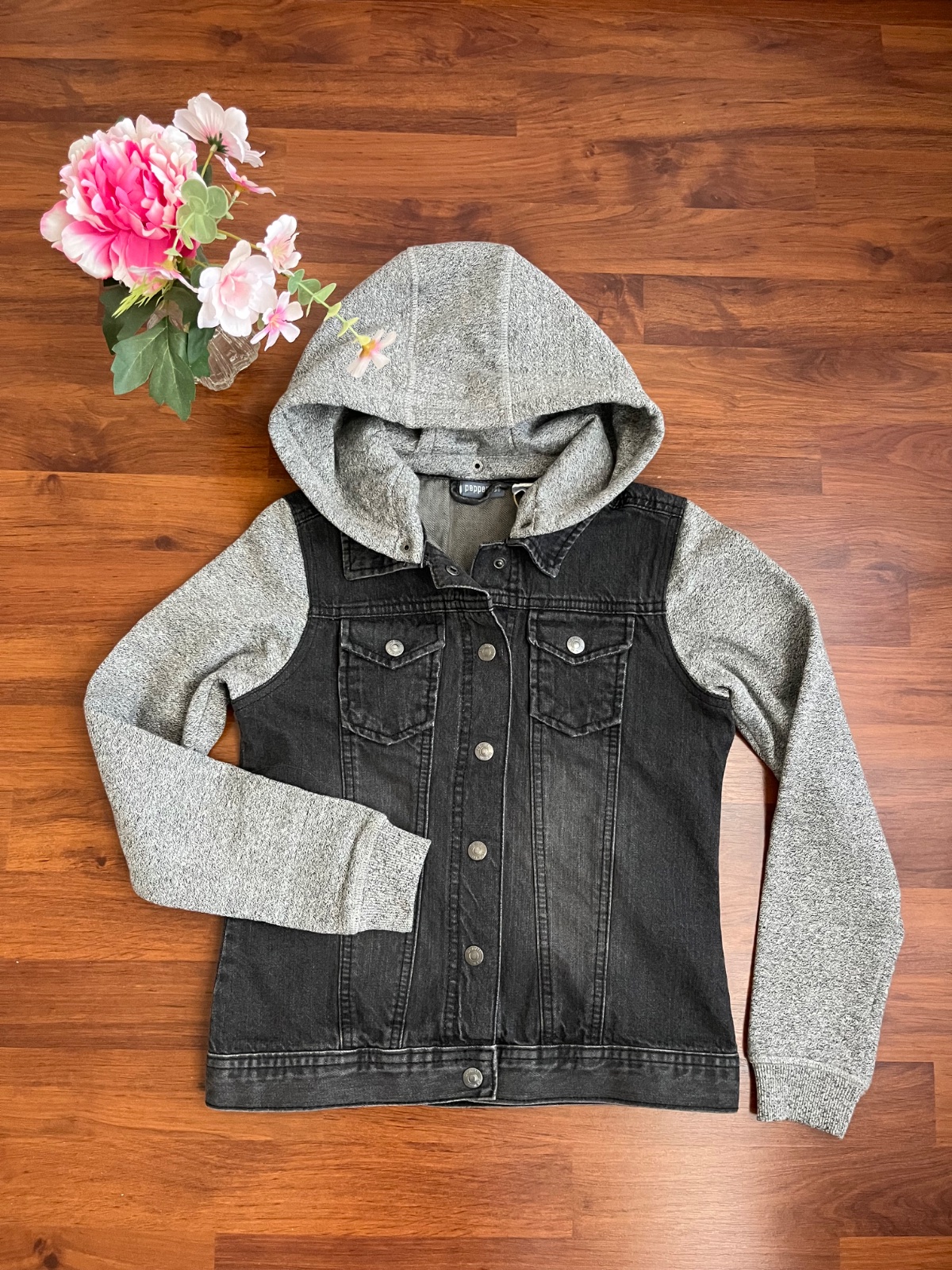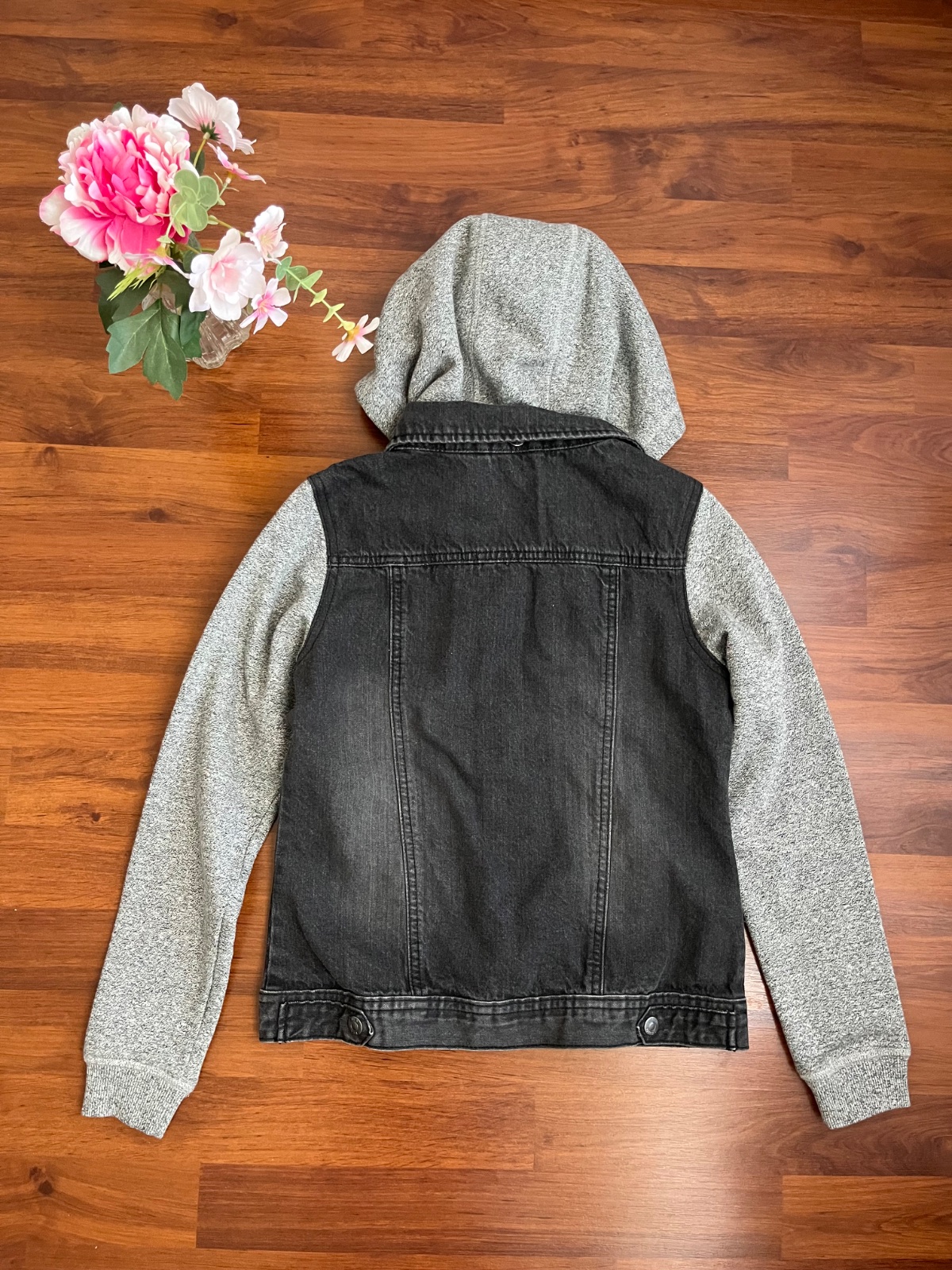 Riflová bunda s mikinovými rukávy a kapucí, která lze oddělat pomocí druků.