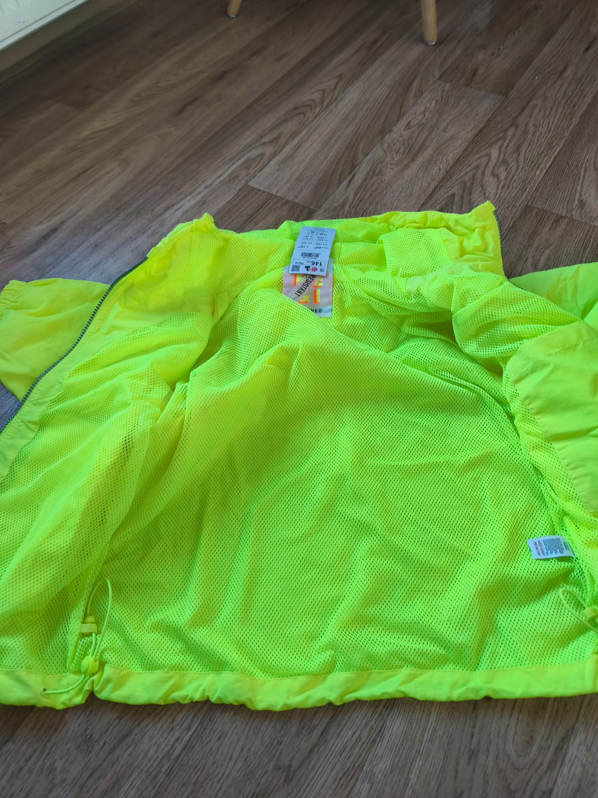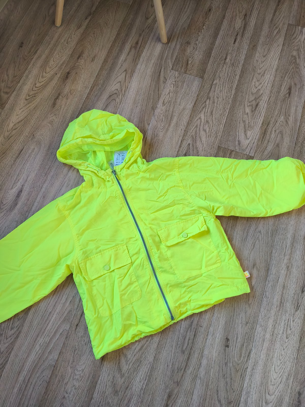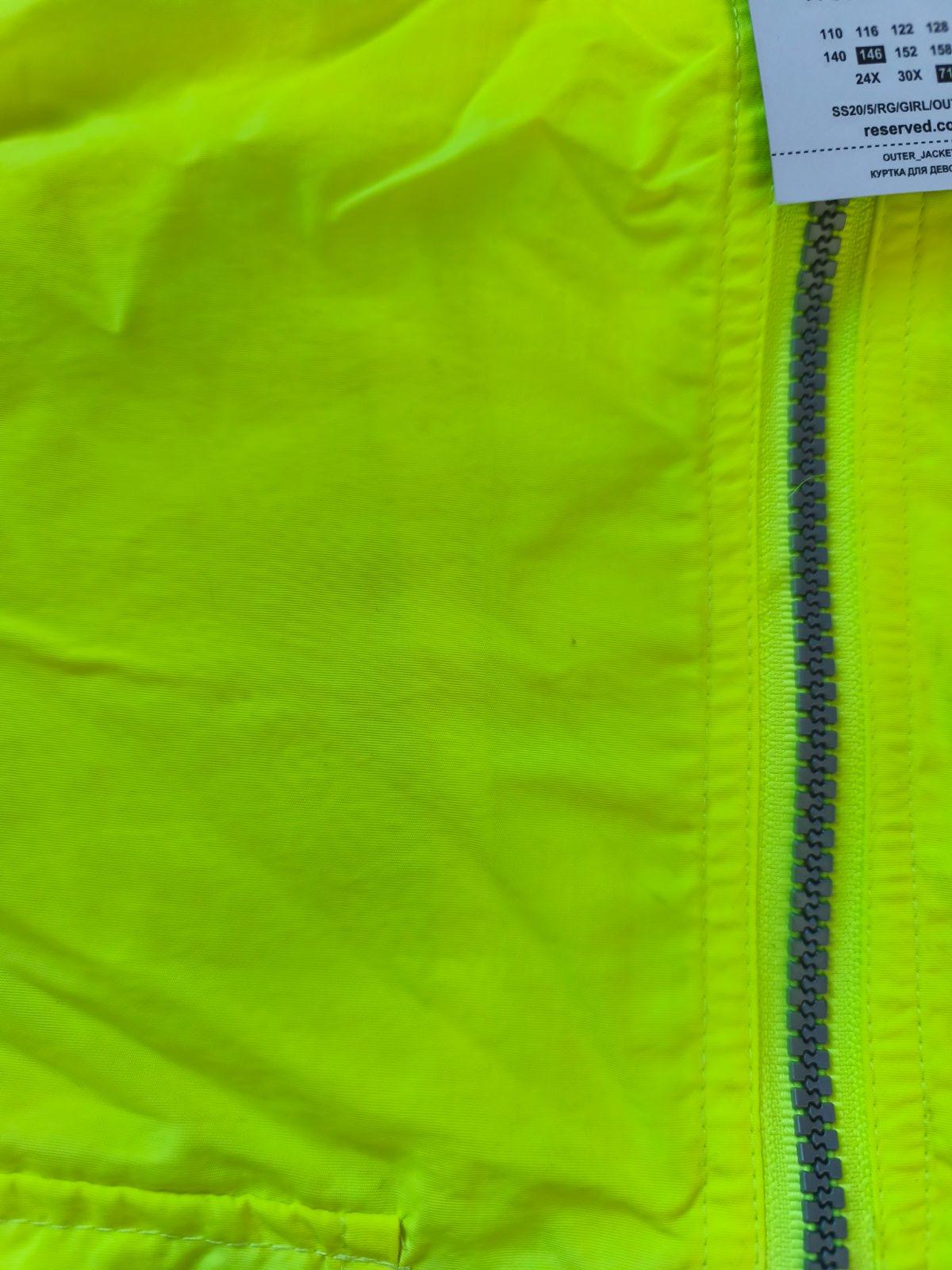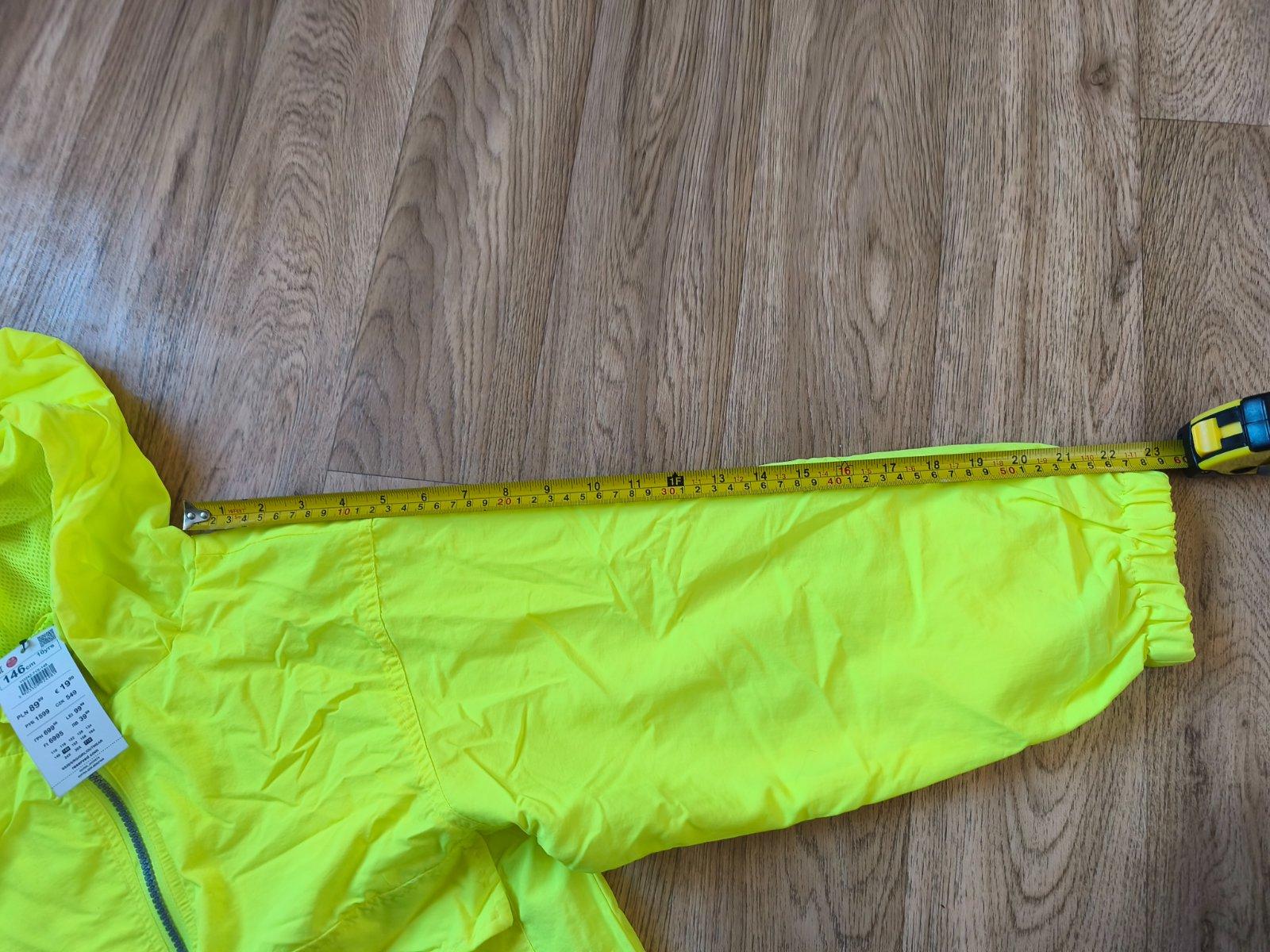 Neon šusťáková bunda vel 146, oversize, sedí i XS/S s 3/4 rukávem. Nenošená, jen na několika místech zašpiněná od manipulace na burze.