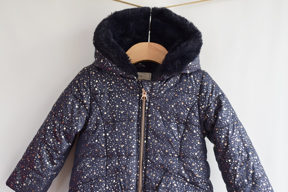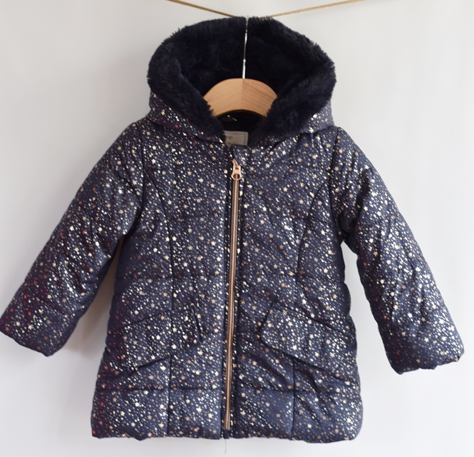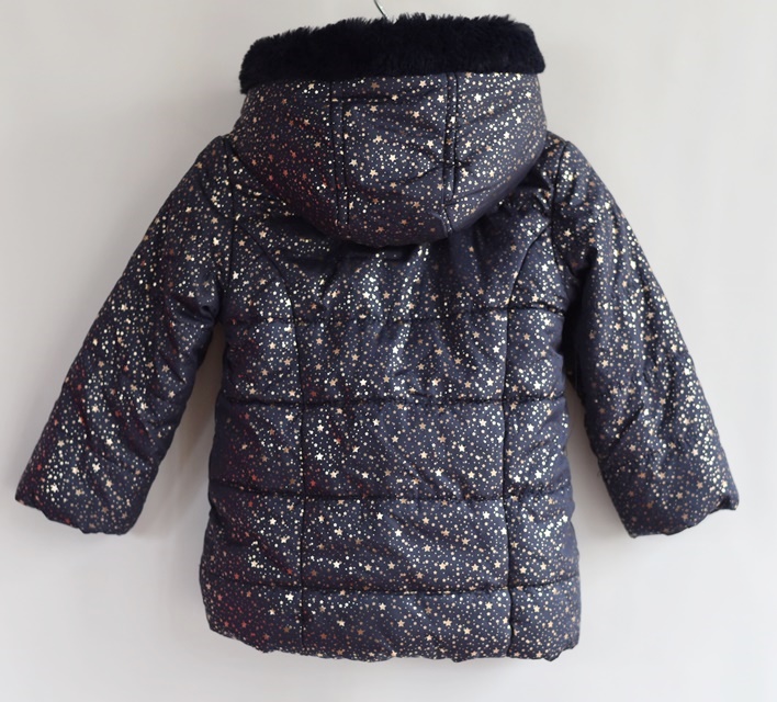 Tm. modrá zimní bunda. Zlaté hvězdičky.