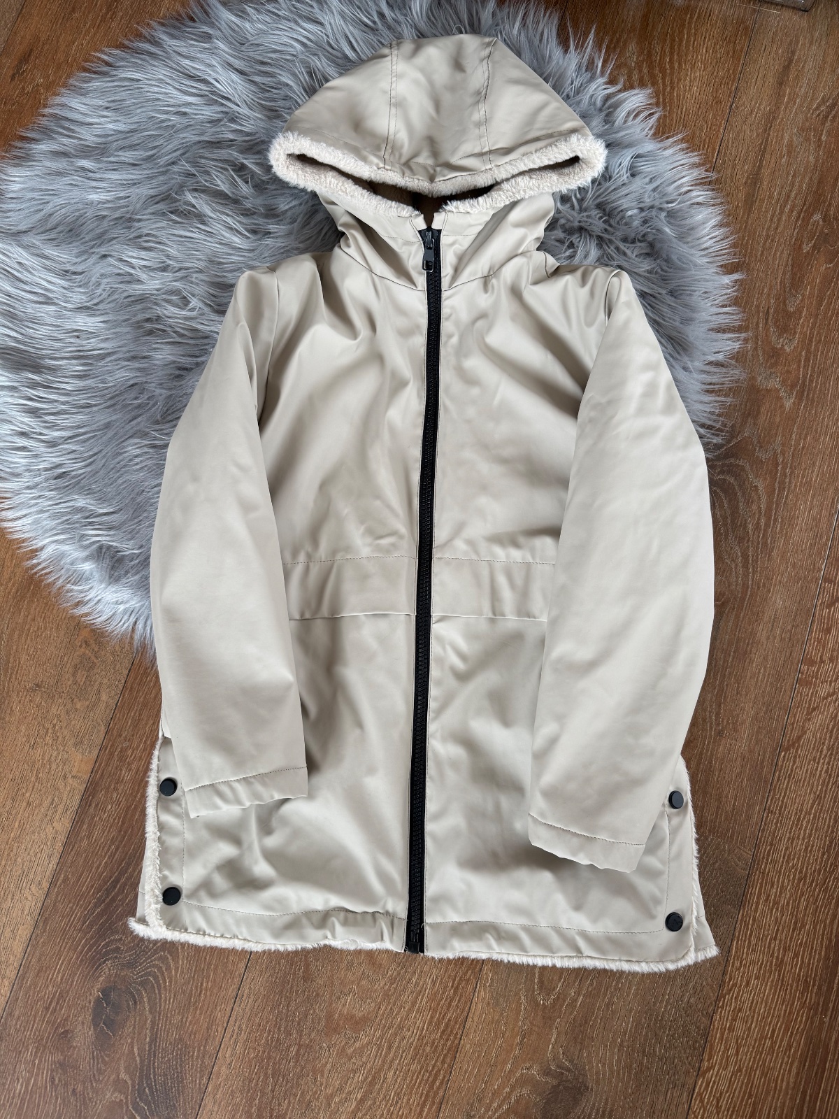 Pěkná, odepínací kapuce na zip,dole patent - mírný žmolík, jinak než vad
