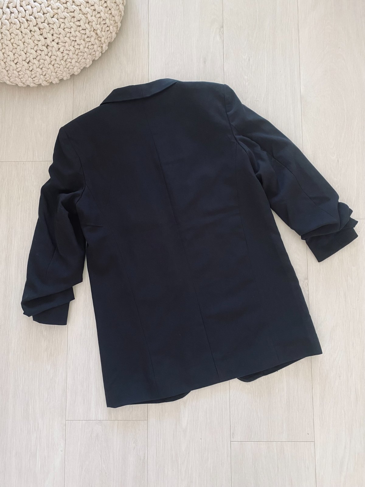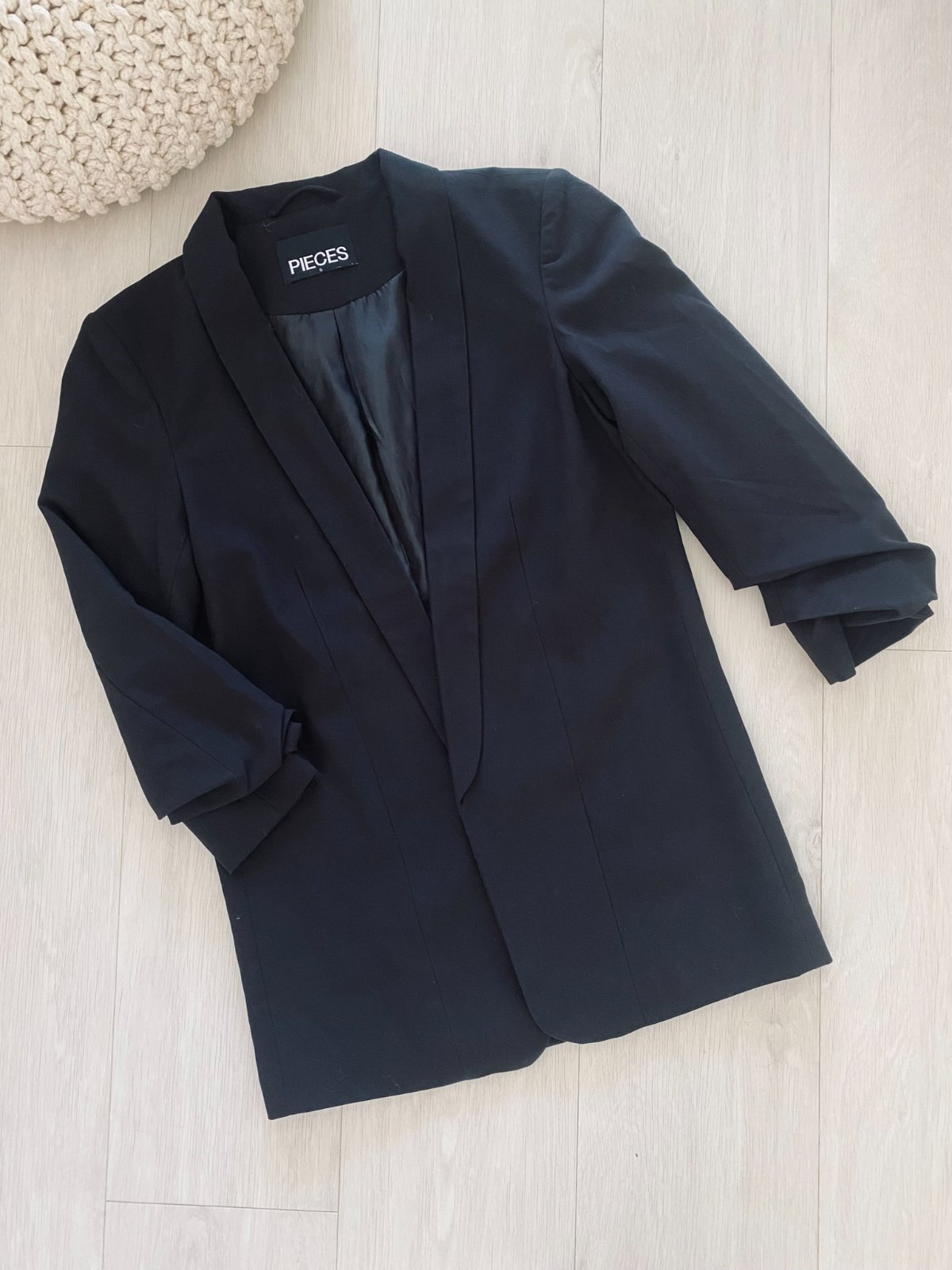 Pružné; podšité, bez zapínání, 3/4 řasený rukáv, límec s klopami, v ramenou vycpávky.