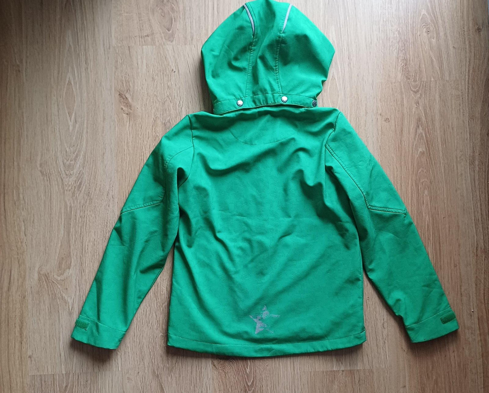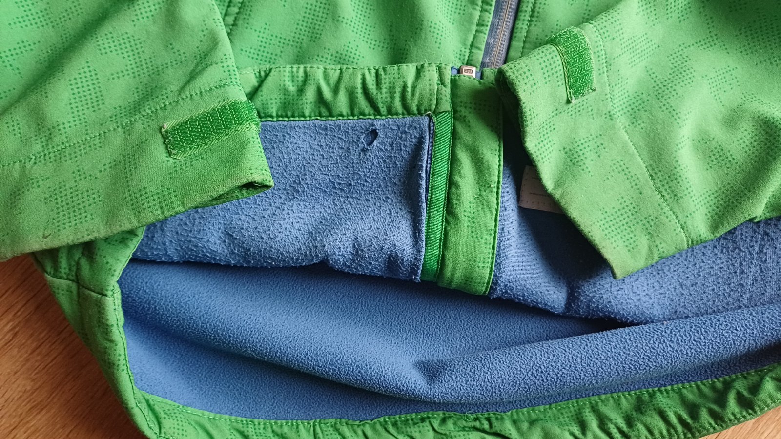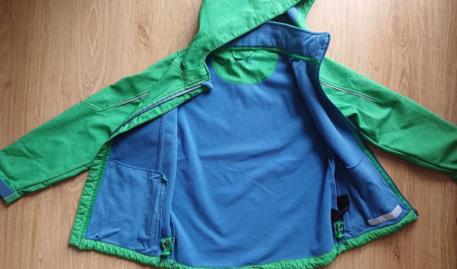 Mekky softshell, uvnitr fleece, noseni celkove uz znat. Svetlejsi zelena, neslo vyfotit. Hlavne na rukavech, na zipu, viz foto. Uvnitr zmolik a dirky. Urcite ale poslouzi na litacku. Kapuce odepinaci na druky. Delka od krku 54, sirka 42, rukav od krkuv 58, od ramene 52,5, vnitrni 40.