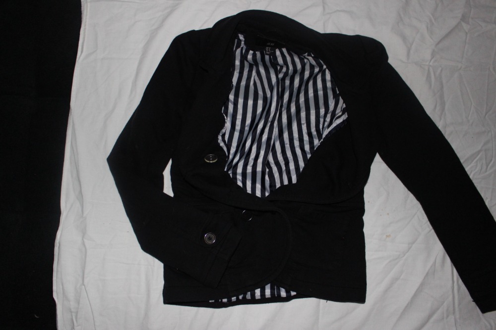 Velmi málo nošené. Slušivý vypasovaný střih s dvouřadým zapínáním na knoflíky, 2 našité kapsy, nabírané rukávy u ramene, výrazná černo-bílá pruhovaná podšívka.
