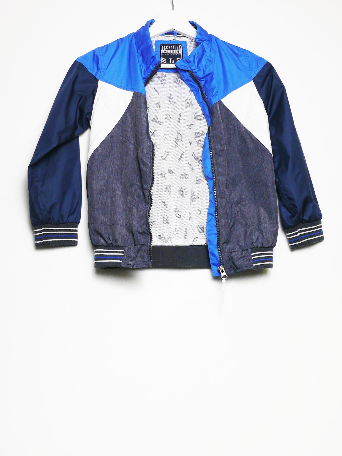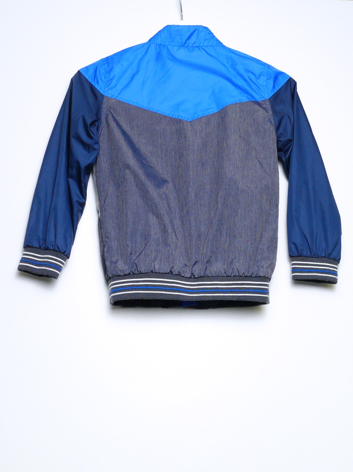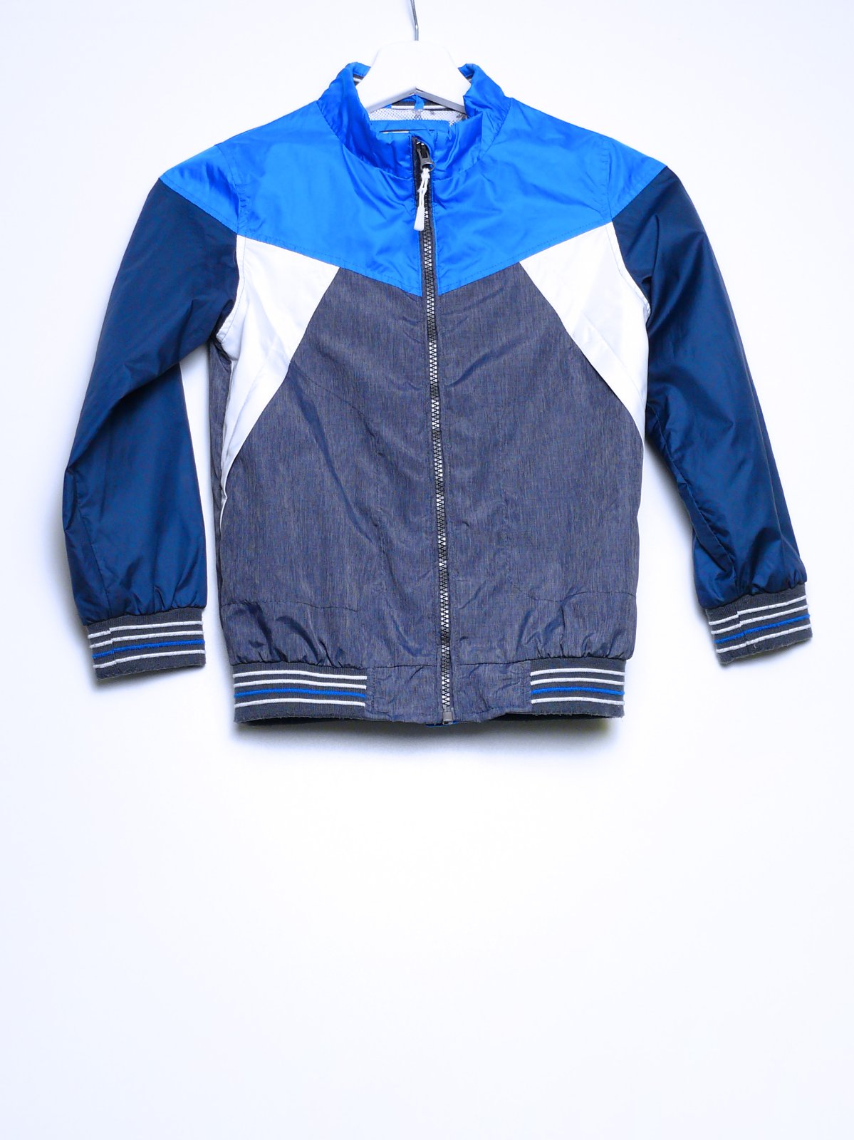 Prodám bílo modro šedou větrovku, velikost výrobce udává 122/128, podšívka síťka, náplety žmolík jinak pěkný stav.