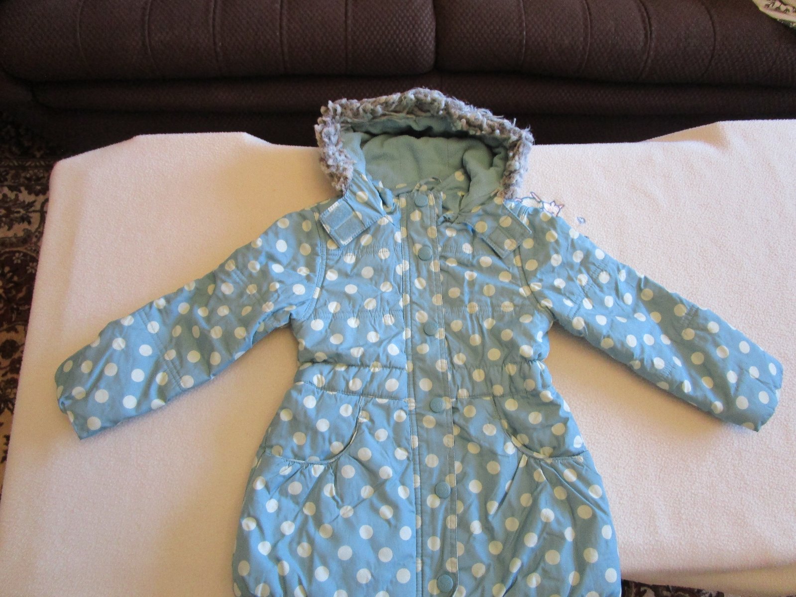 Pěkná dívčí delší zimní bunda s kapucí, zapínání na zip + druky, kapsičky, vel. 110, velmi pěkná, jen kožíšek okolo kapuce sepraný, proto cena jen 49 Kč, zn. Millie.