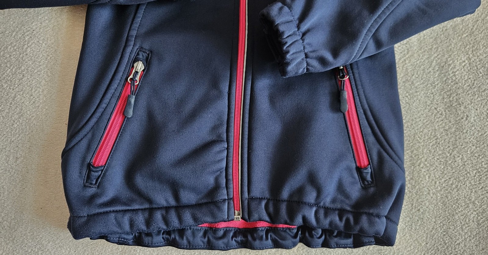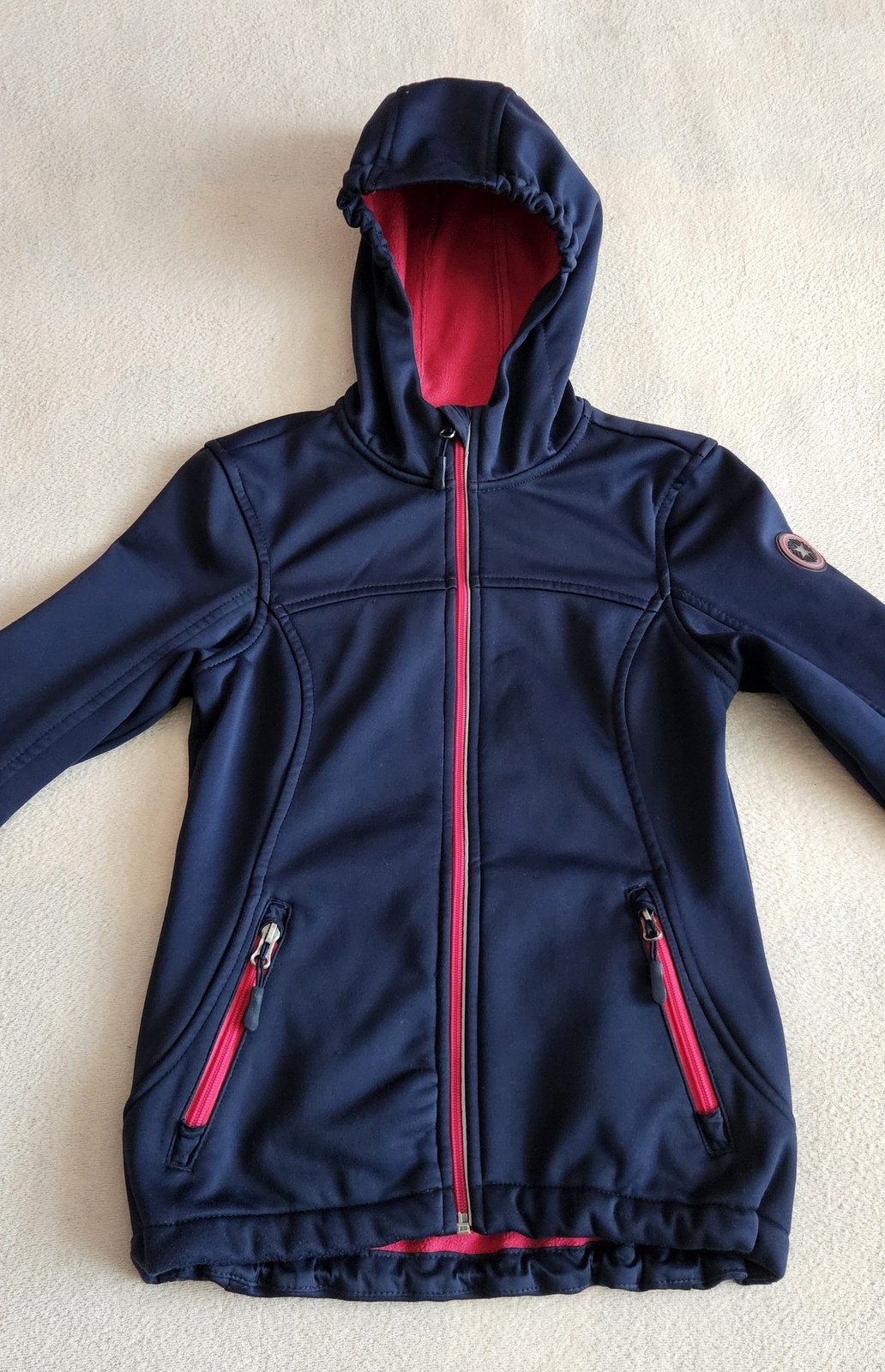 Ve výborném stavu prodám tmavě modrou dívčí softsheelovou bundu podšitou sytě růžovým hřejivým fleesem.