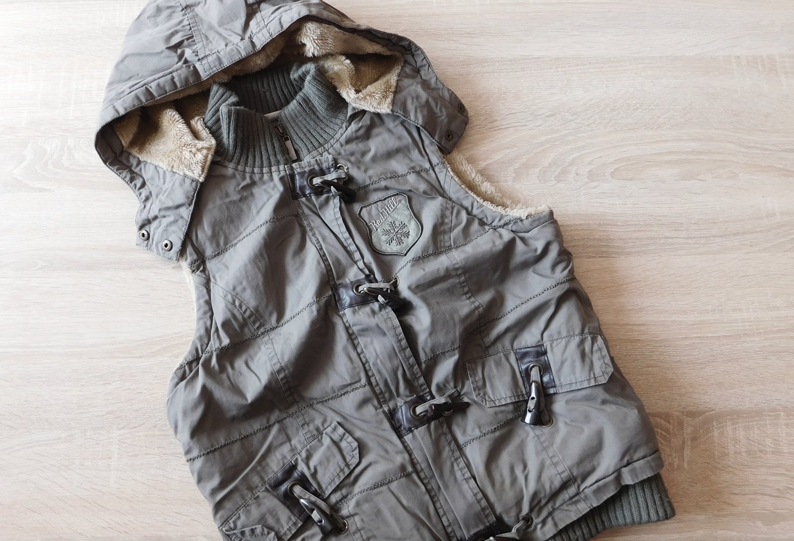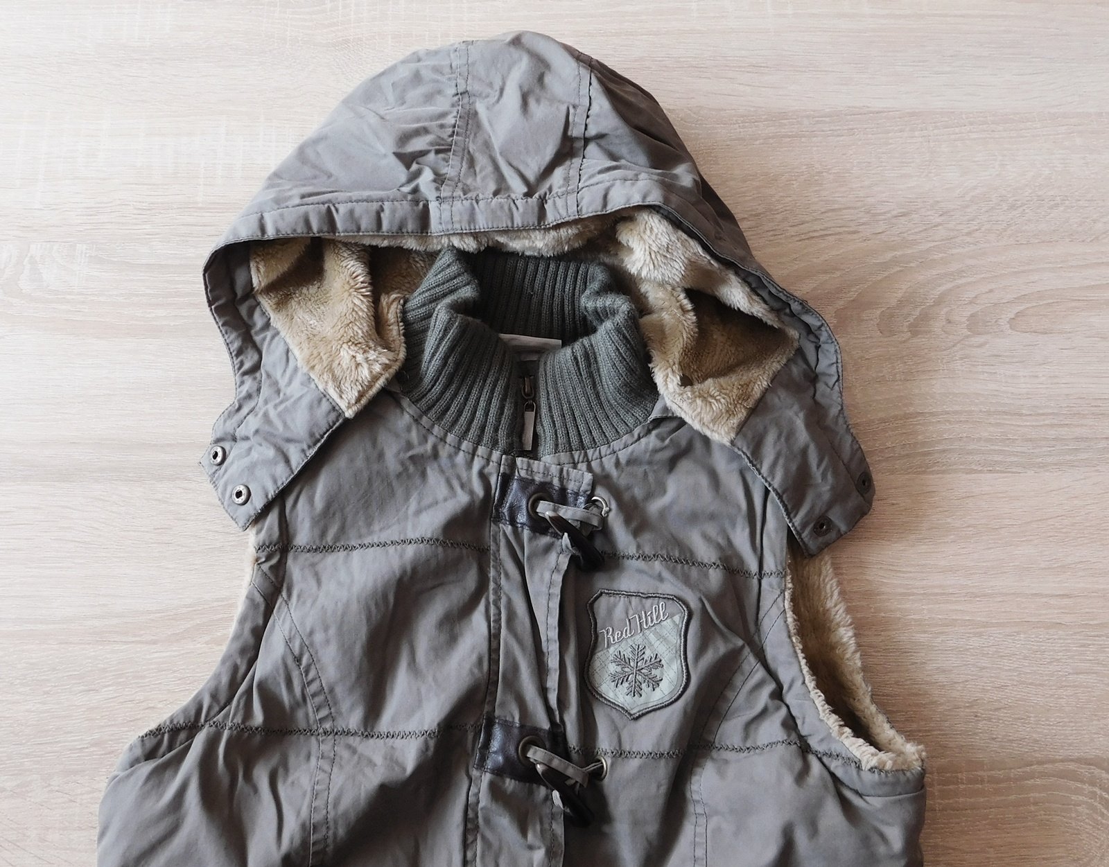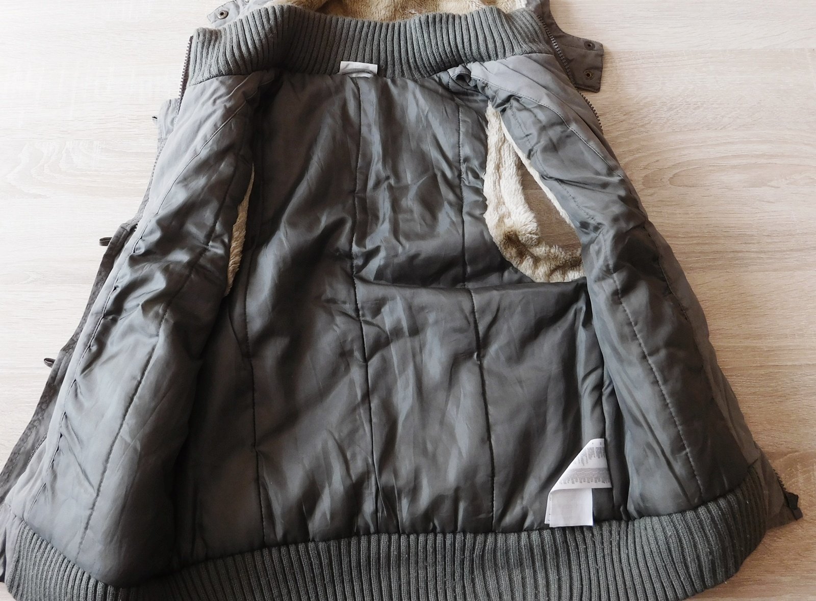uvnitř teplá podšívka,odepínací kapuce,d.57cm,š.2x44cm,zašitá dírečka vedle kapsy/viz.foto/