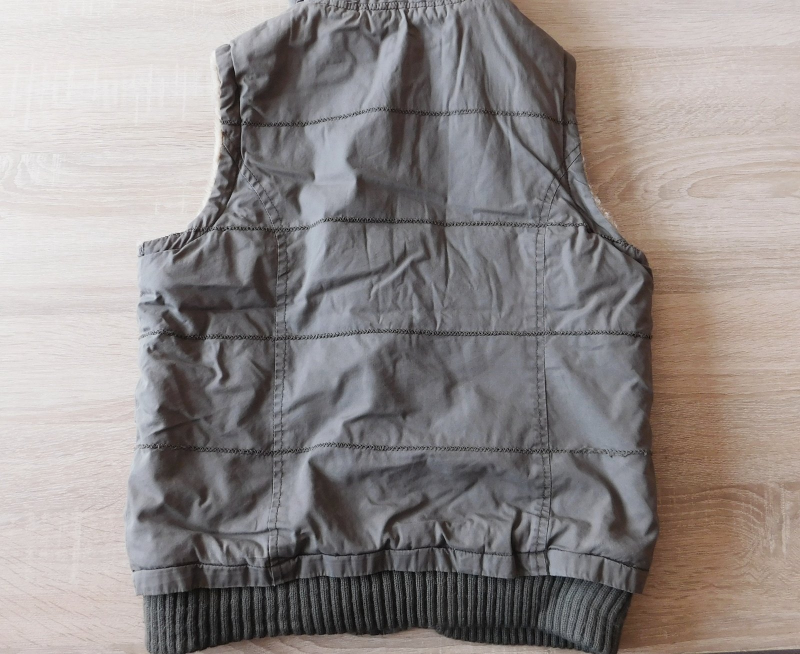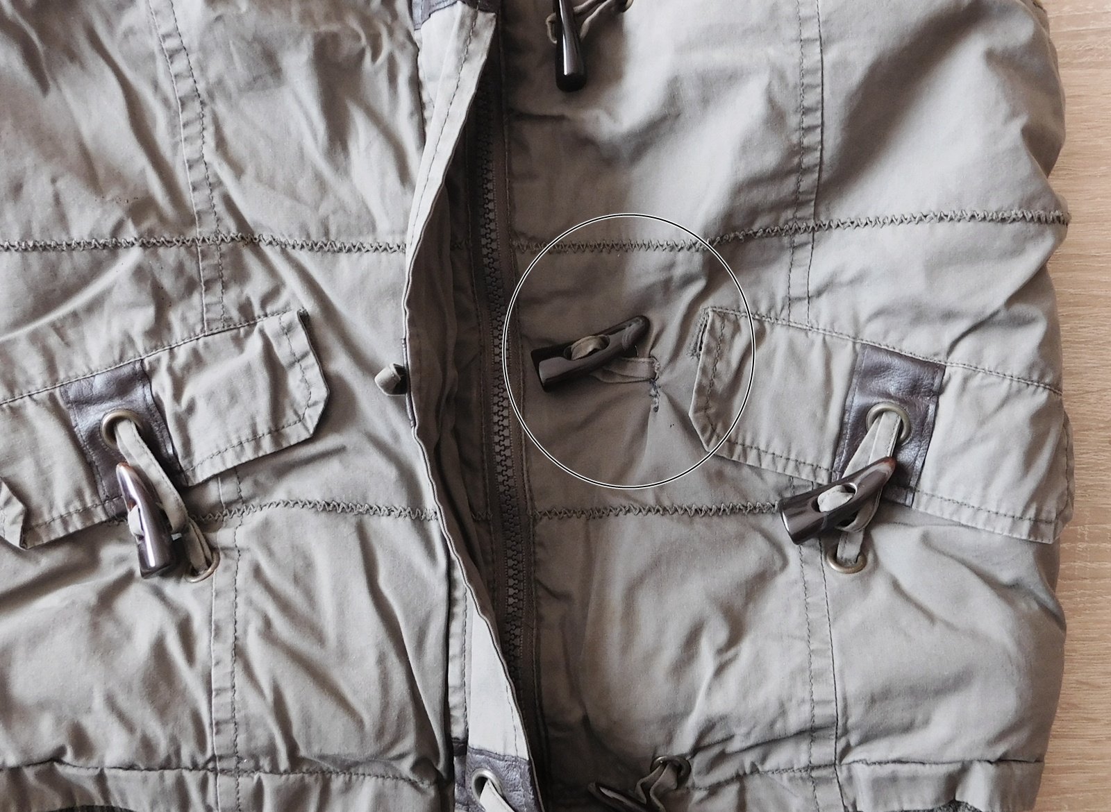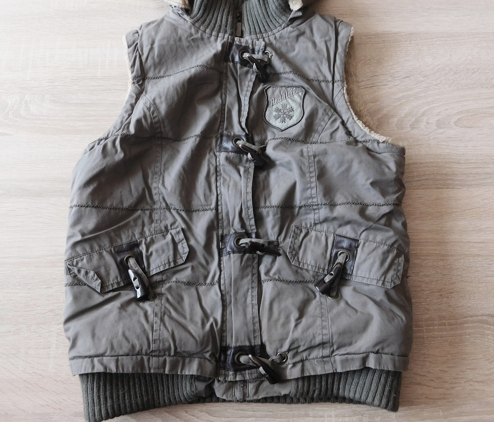 uvnitř teplá podšívka,odepínací kapuce,d.57cm,š.2x44cm,zašitá dírečka vedle kapsy/viz.foto/