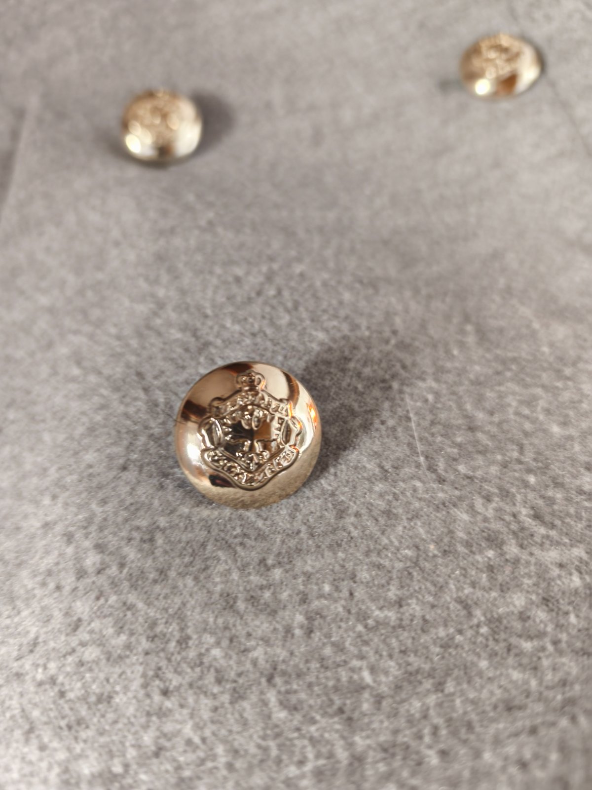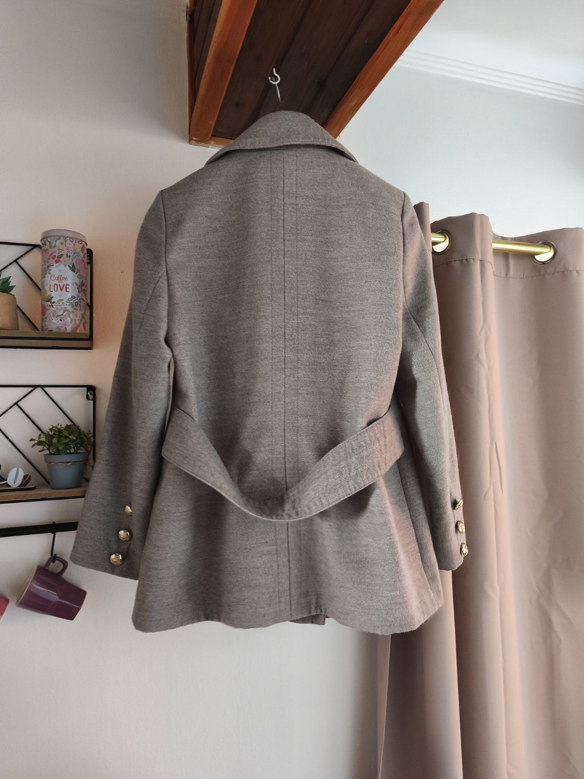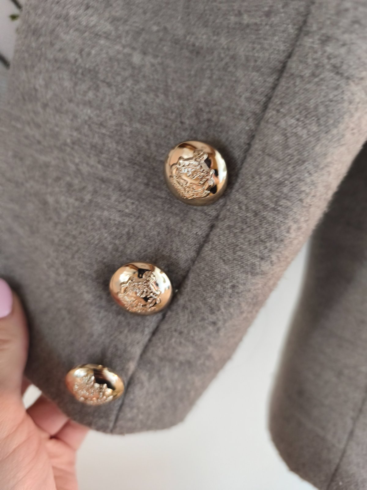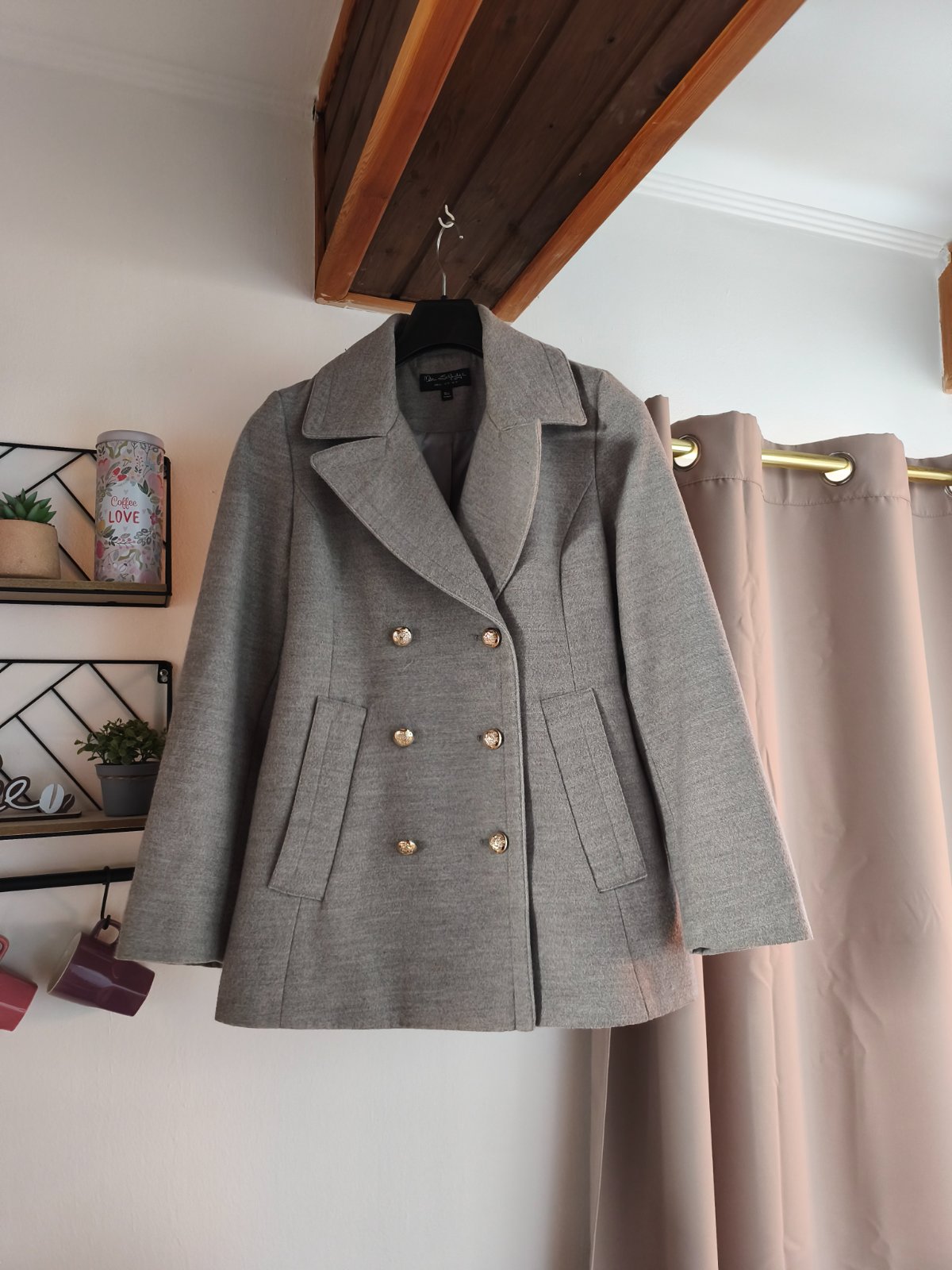Krásný přechodový kabátek s ozdobnými knoflíky, nošený při L/XL, měřte. 2 flíčky, zkusím ještě vyprat.