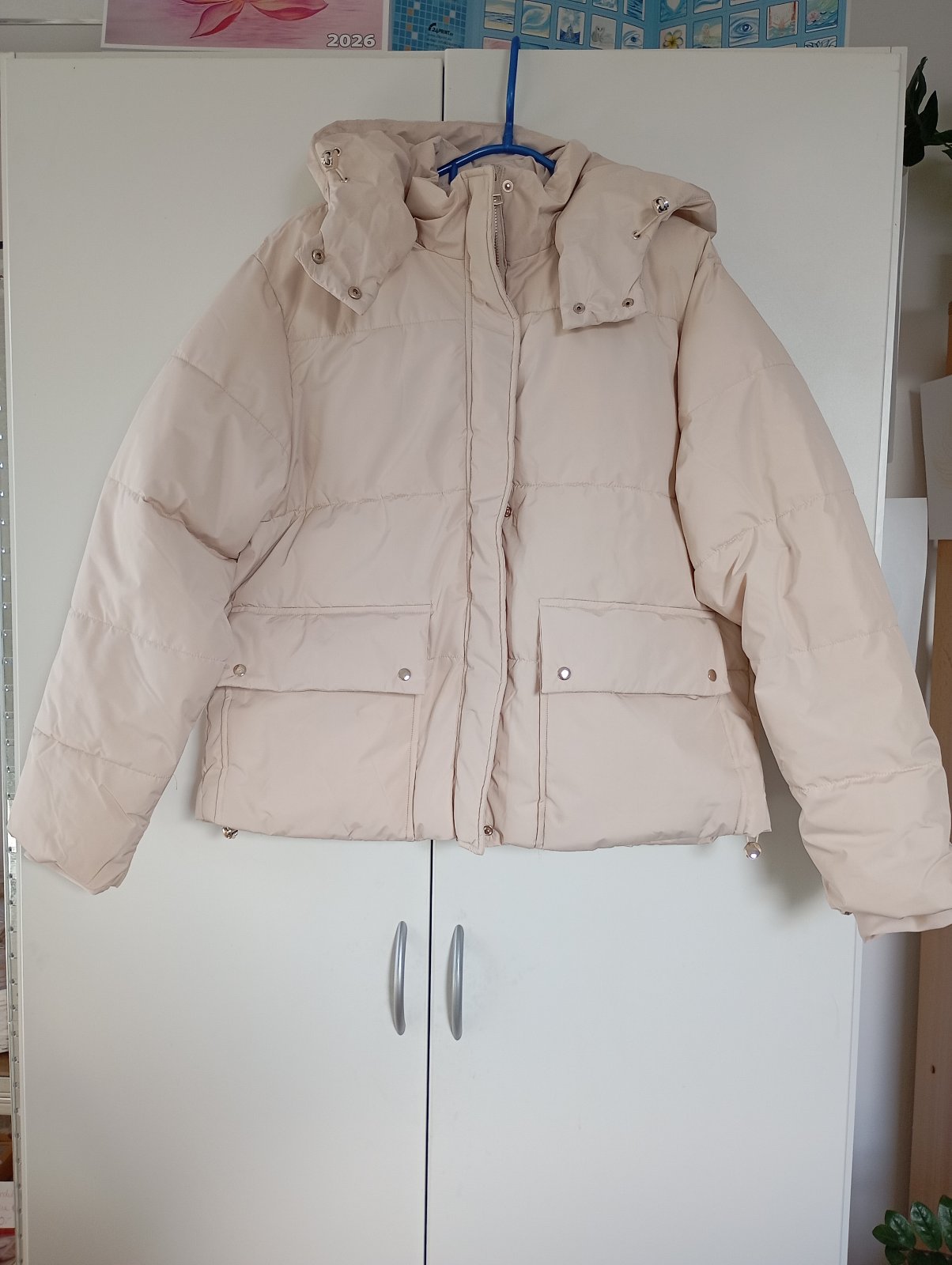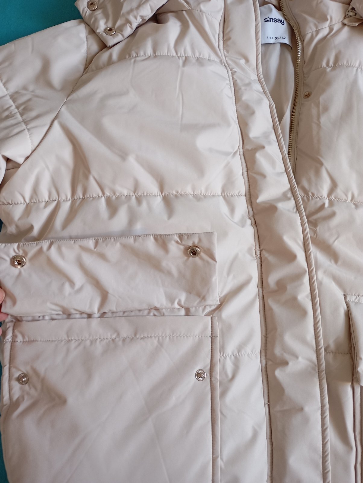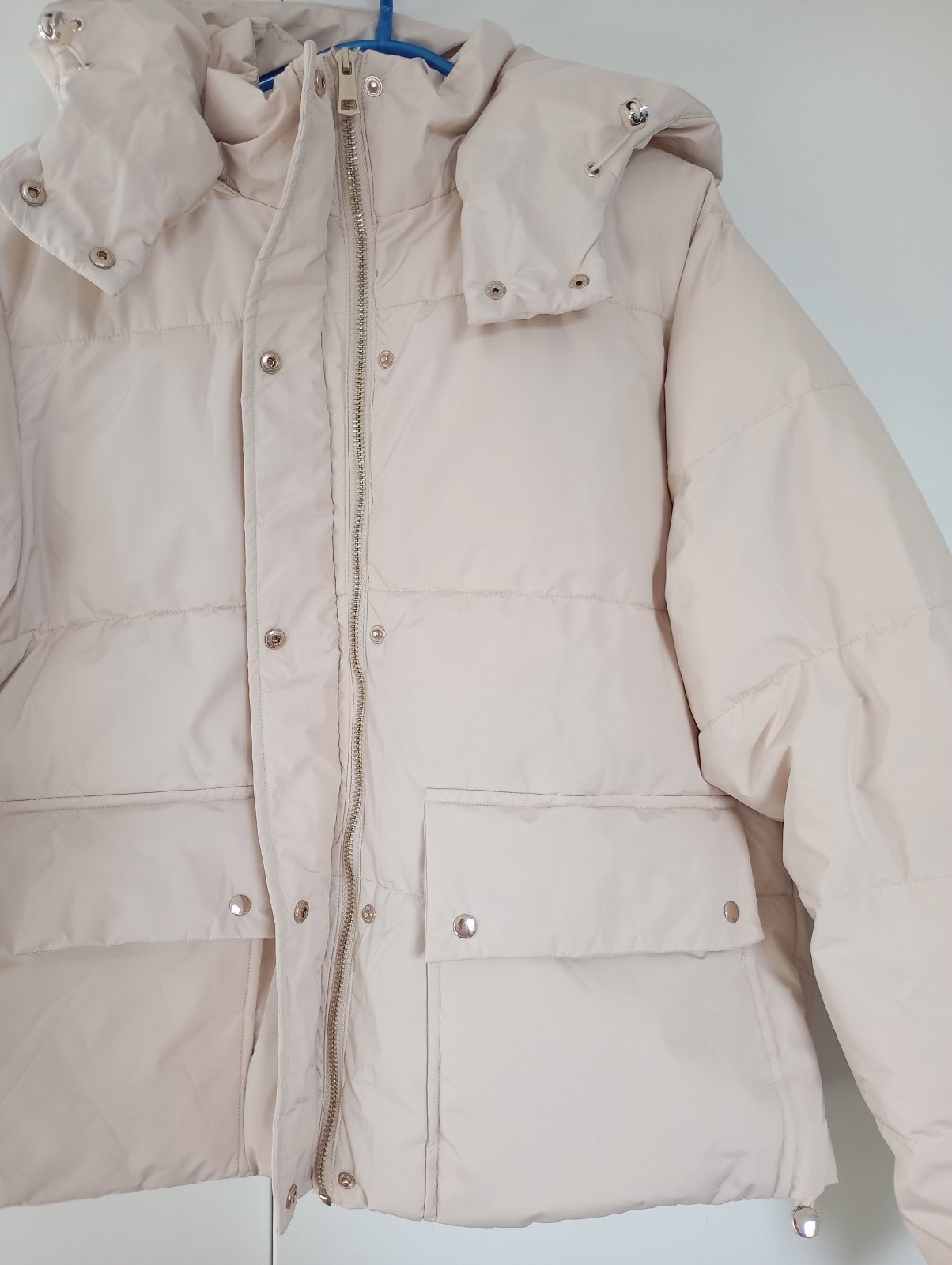 NOVÁ NÁDHERNÁ puffer zimní bunda se stojáčkem pro ženy velikost XL 42, odepínací kapuce, zapínání na zip a na patentky, klasický střih se stahovacími pásky, dvě kapsy vepředu na patentky.