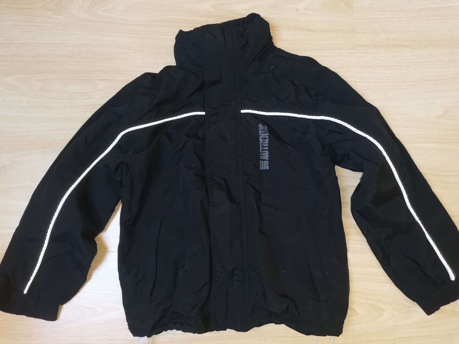 Celá černá bunda s polyesteru (venku jako mikrovlákno, uvnitř flís). Je spíš na chladné léto, či teplé jaro. Uvedená velikost 122/128 souhlasí. Na levém rukávu je zašitá malá dírka viz foto.