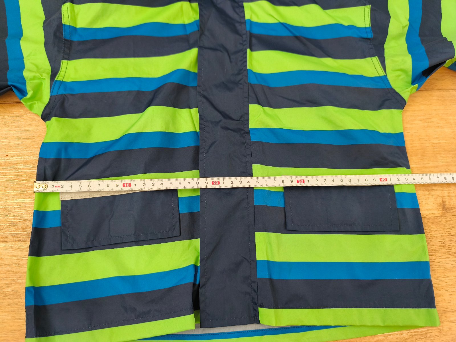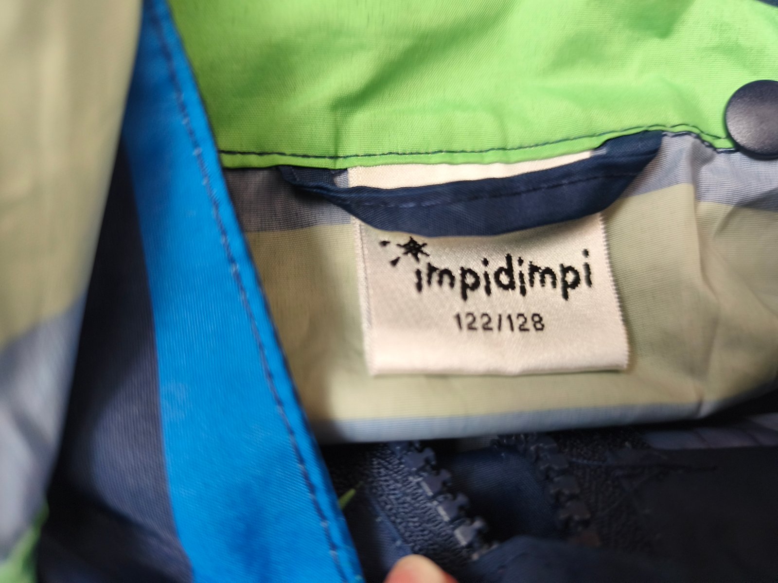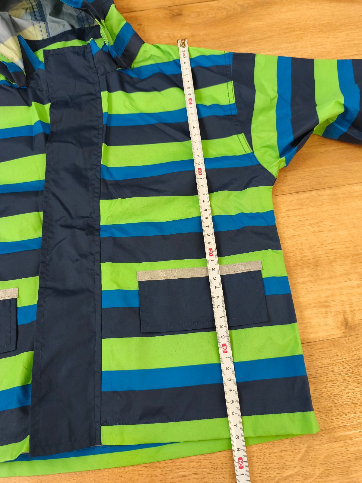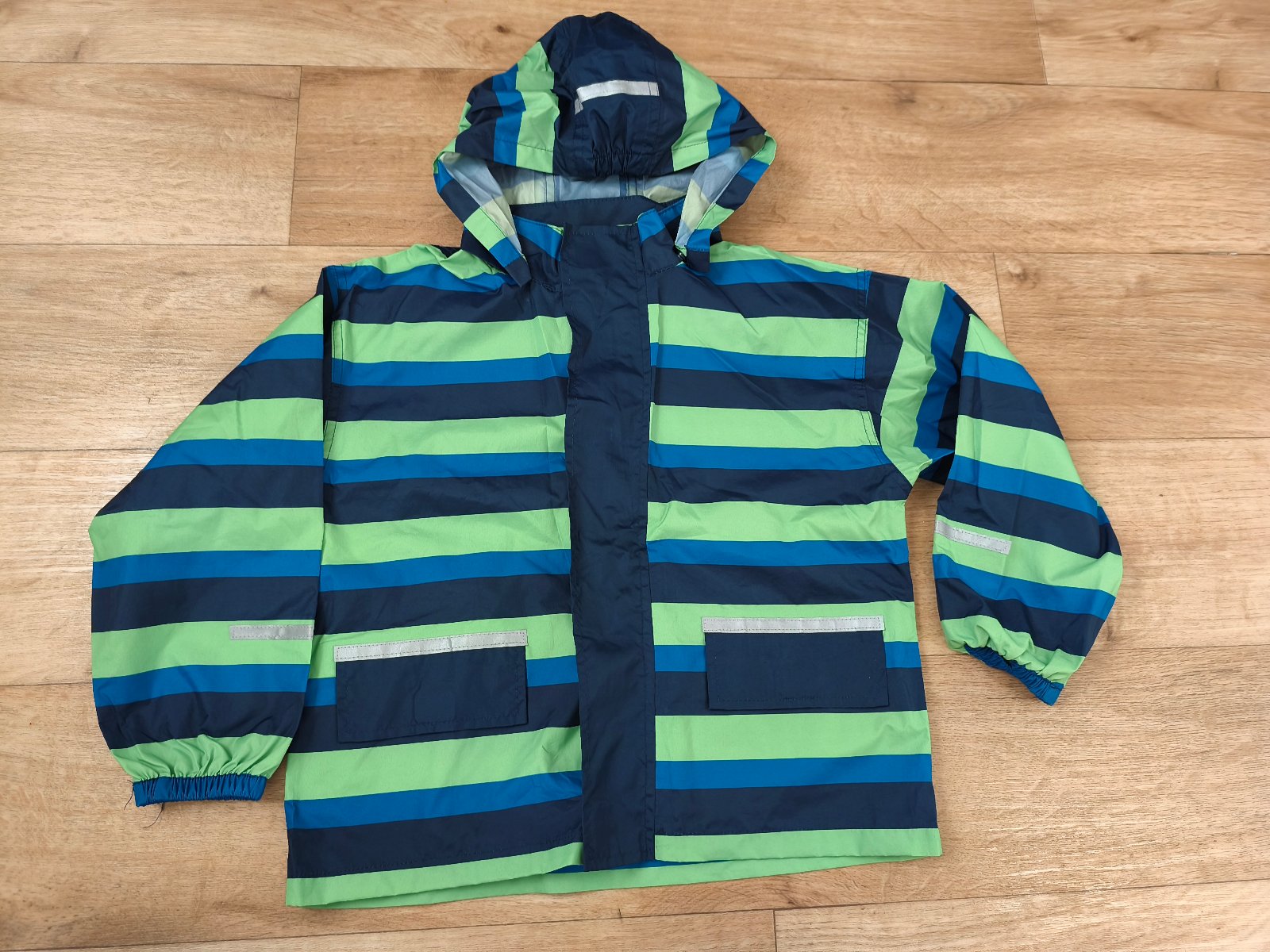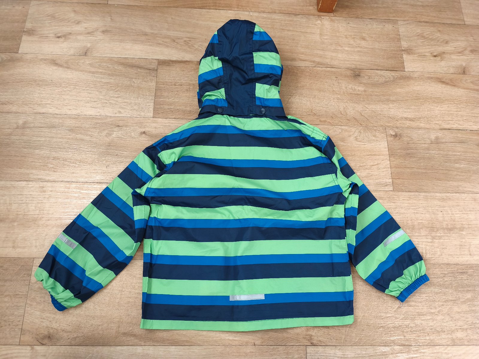 Větrovka/bunda do deště s odnímatelnou kapucí. S kapsami a reflexními prvky. Velikost 122/128 - rozměry a podrobný stav na fotkách.