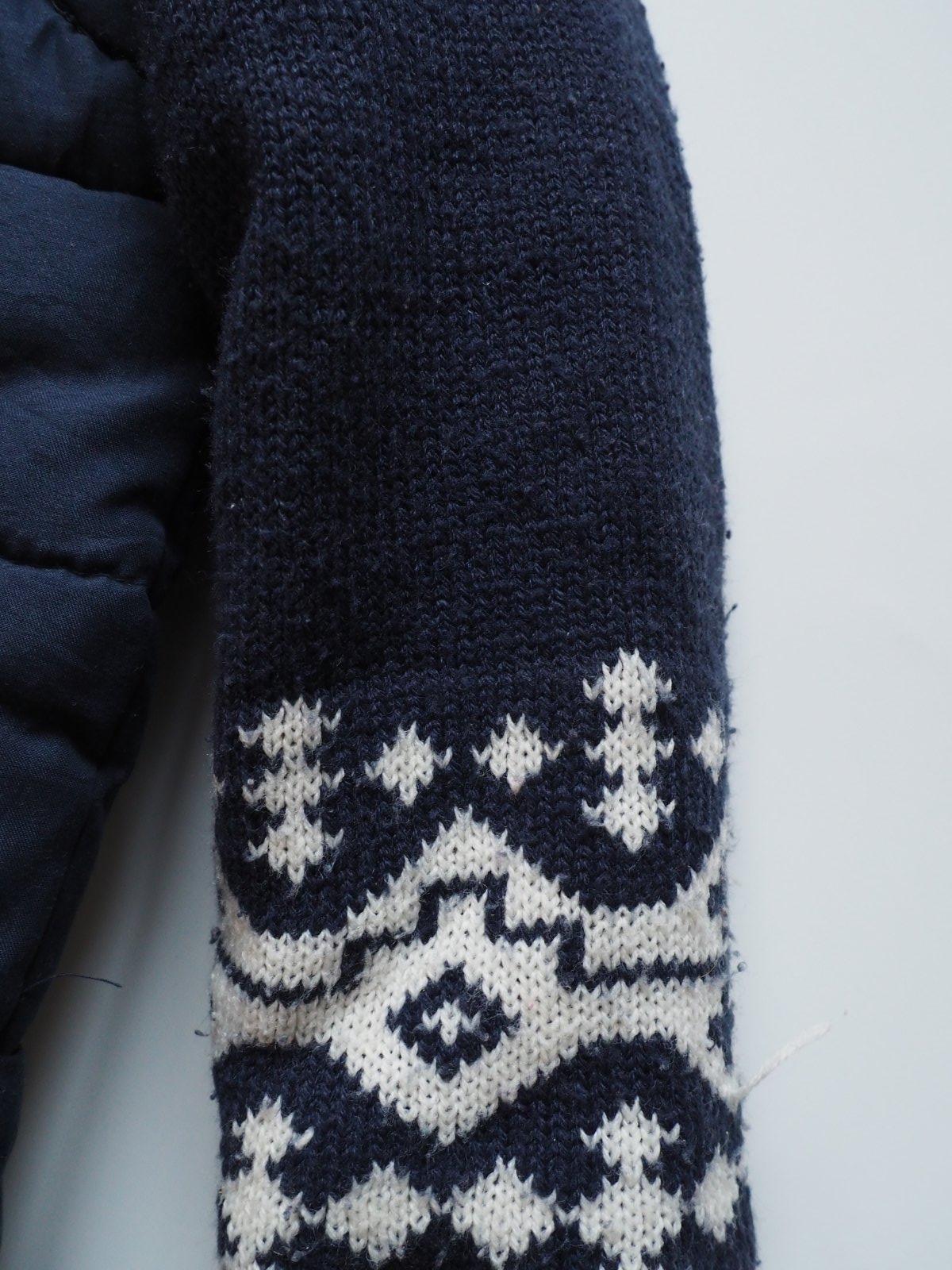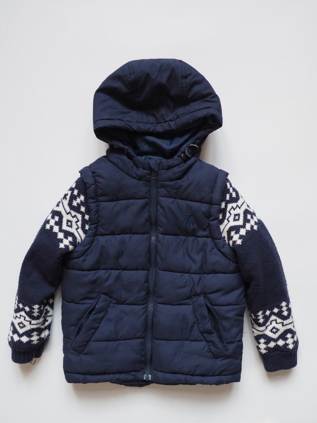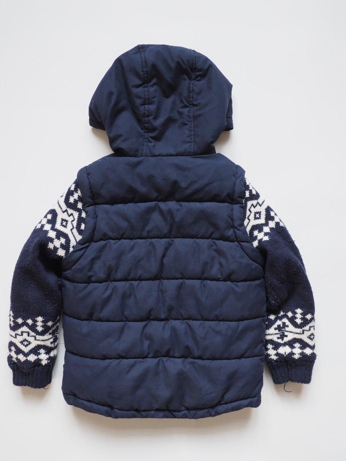 Teplá přechodová bunda s pletenými rukávy.