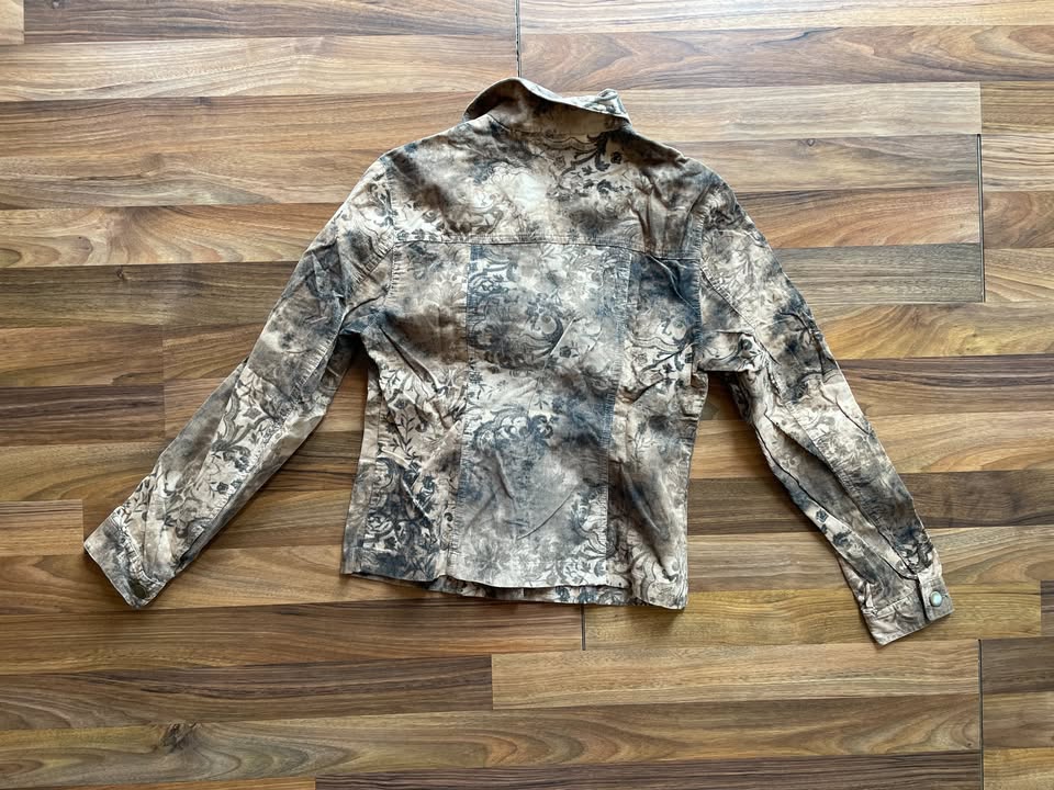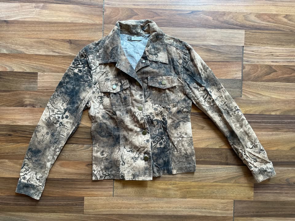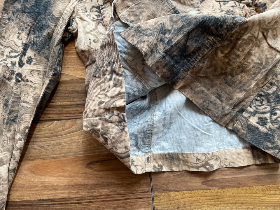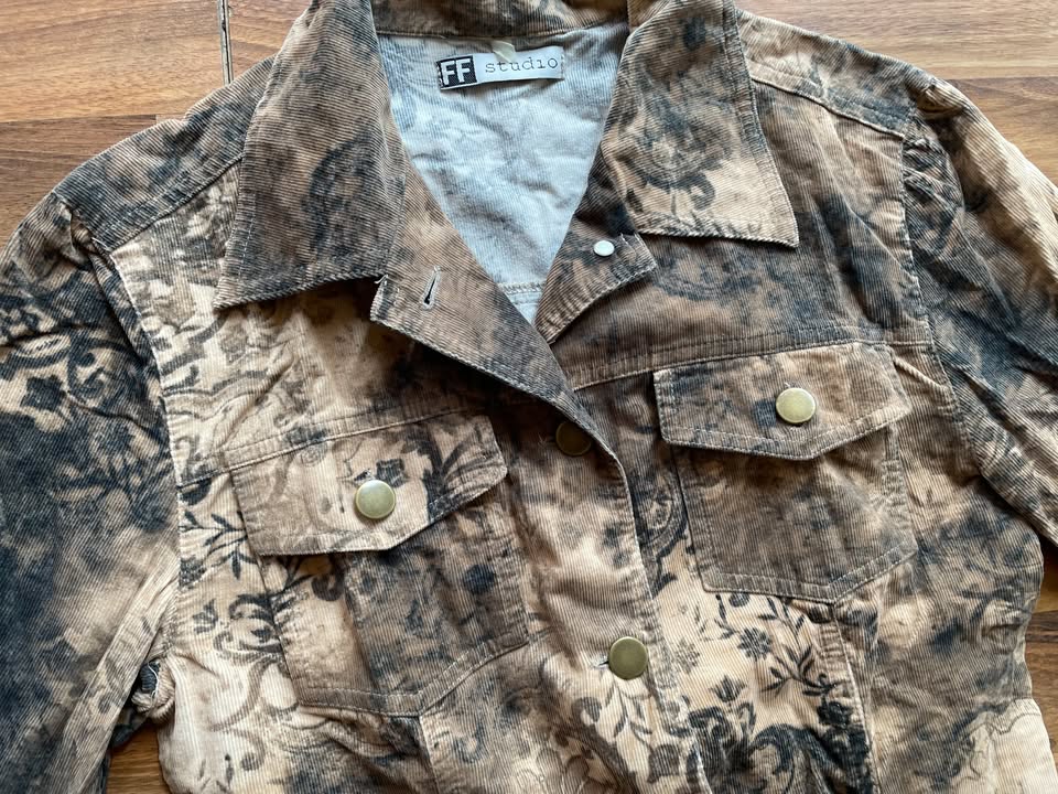 1534. nabízím k prodeji tuto nevšední lehkou bundu, vel není uvedena měla by odpovídat XS, max S - prosím měřte, FF studio. Tenoučký, jemný manžestr (na dotek podobný jako flaněl, příjemný). Barvy jsou teplé odstíny (šedé foto neodpovídá - občas mi to dělá foťák!) v okrové až hnědé. Nevšední motiv květin, větví a ornamentů. Materiál 100% bavlna. Nošená, bez vad, krásná