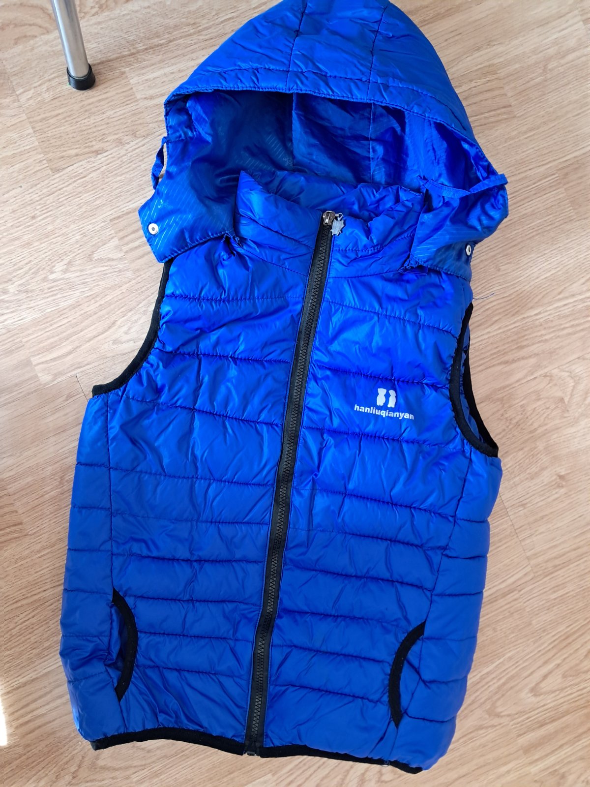 Krásně naducaná, skořicová vesta nošená krátce jedním dítětem, svrchní materiál polyester, uvnitř teplý fleec, mezivrstva vatelín, efekt vrstveného oblečení, vypodložená, tmavo modrá úpletová kapuc...