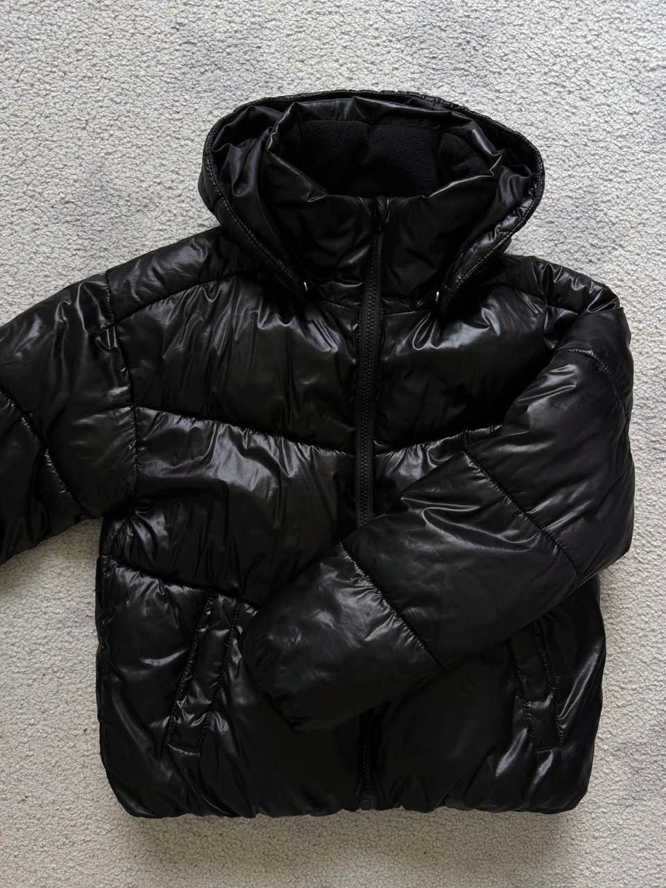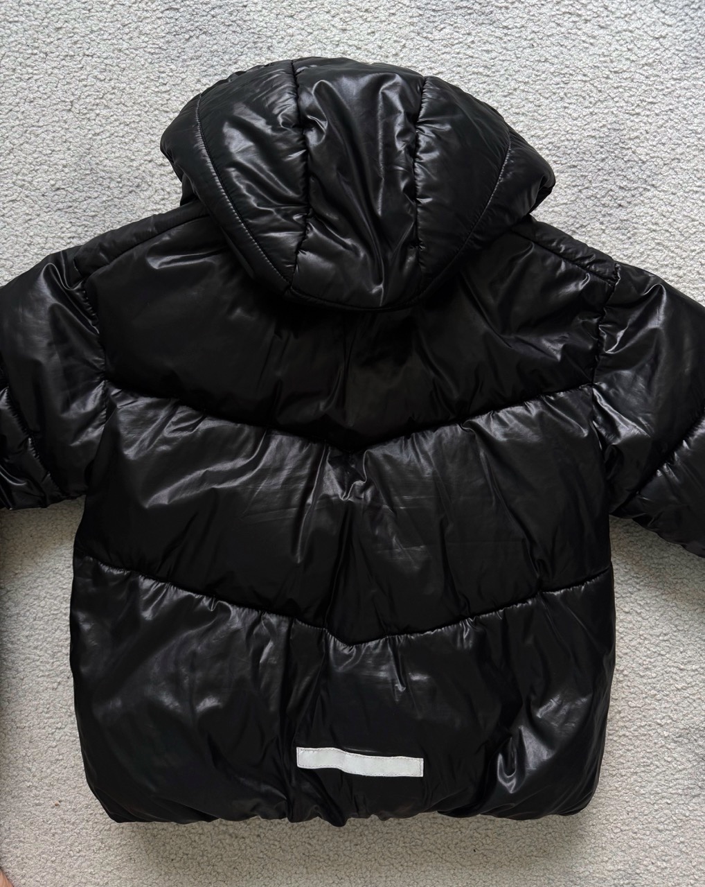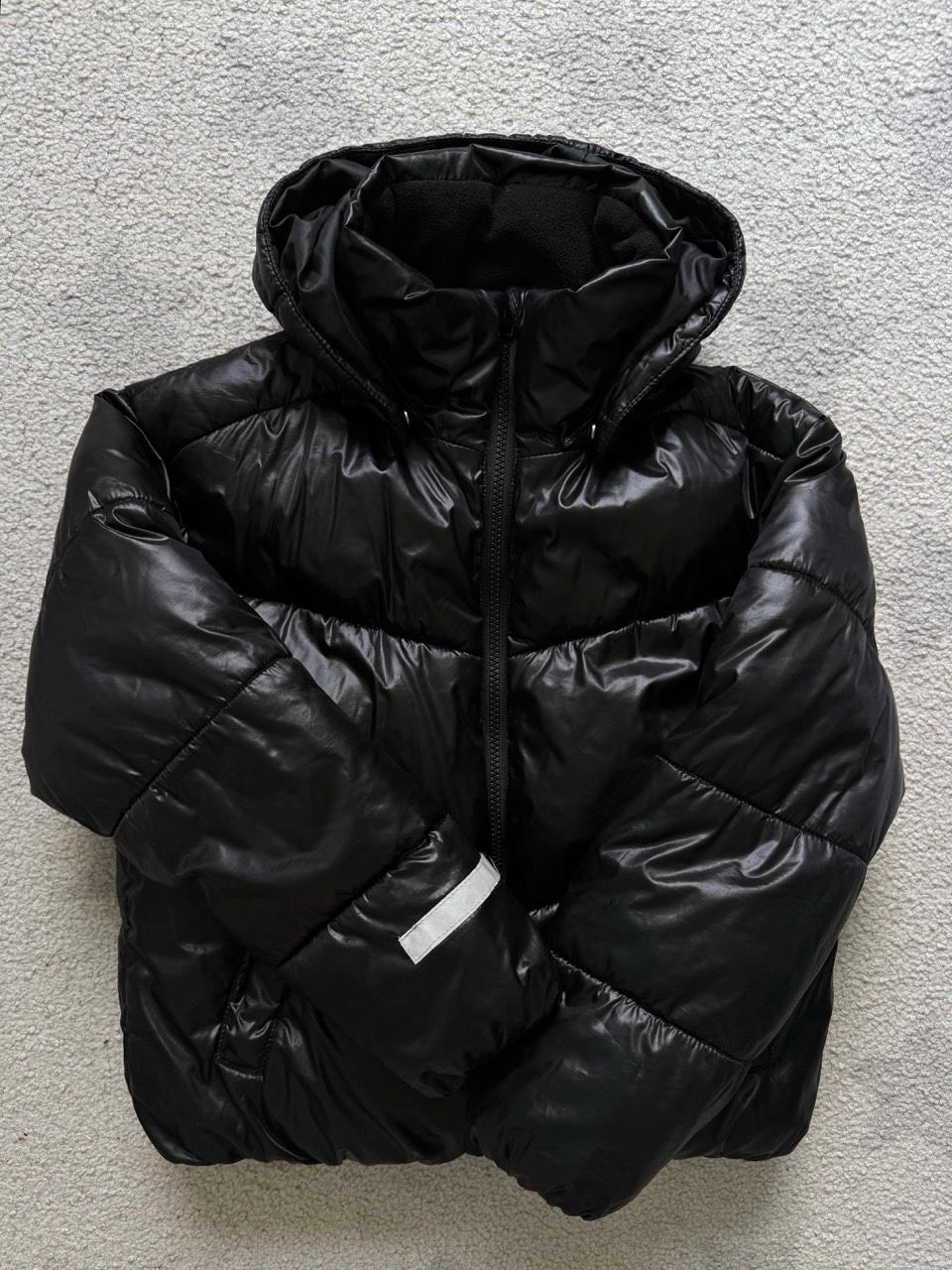 Zimní bunda černé barvy se zapínáním na zip. V horní části dvě kapsy na zip, ve spodní části další dvě kapsy. Kapuca s reflexním proužkem a se stažením na tkaničku. Na konci rukávů náplet proti sně...