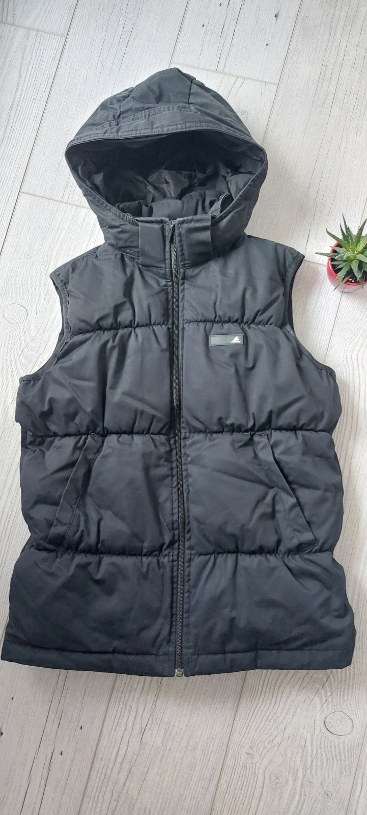 Černá prošívaná vesta, nošená bez vad, kapuci lze odepnout, vel.164 ,ale já nosila a mám velikost M, prosím měřte délka 68 cm , šířka pod průramky 53 cm