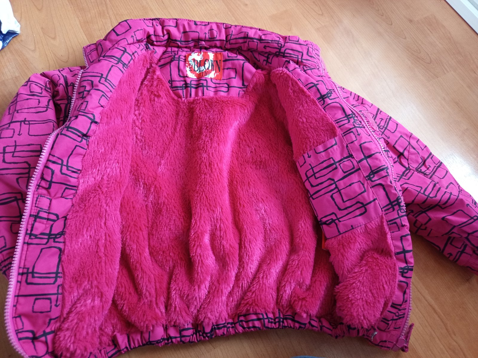 Zimní bunda vel. 110/116, podšitá fleecem a šusťákem, nošená a praná, kožíšek kolem kapuce je sleželý a potřebovala by pořádně vyprat, rukávy jsou maličko ušmudlané a na hrudníku je maličký flíček,...