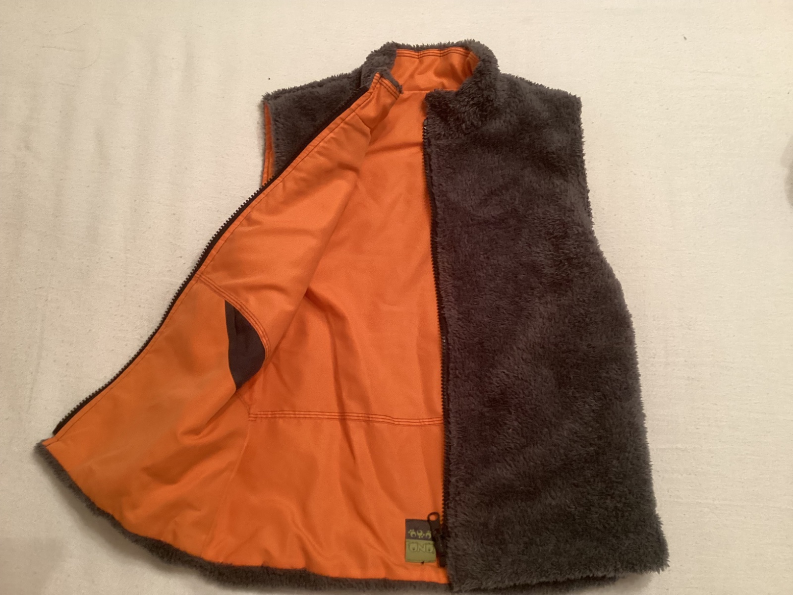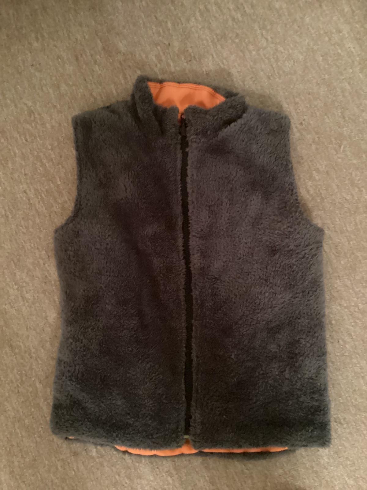 Vesta bez uvedené velikosti na zip. Odhadem vel 128. Délka zad 50 cm, šířka pod rukávy 41 cm. Barva je hezky tmavě šedá, bez fleků