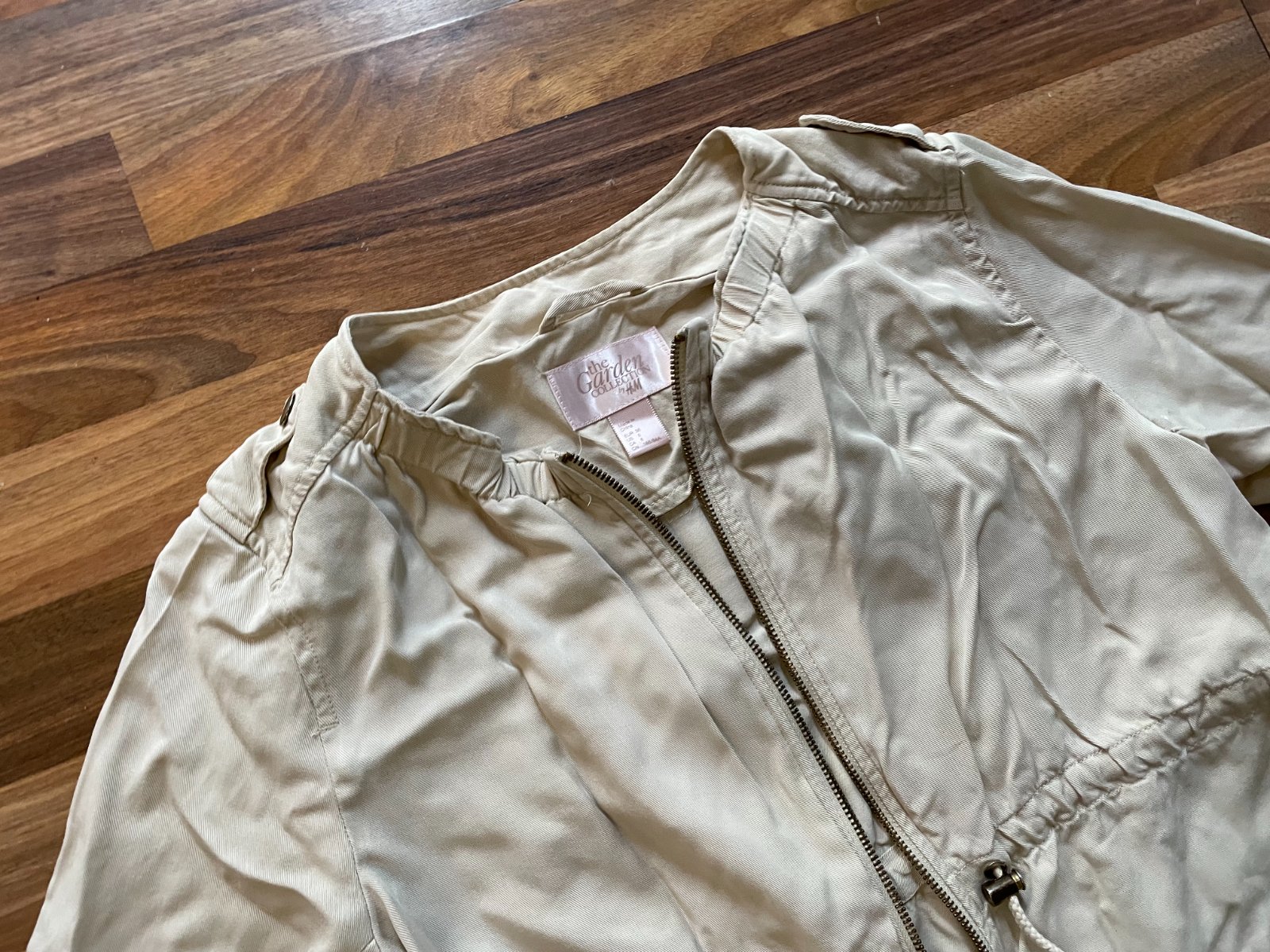 let. nabízím k prodeji tuto budnu/ trenčkovt vel 36/S, HM, Garden coll. Nezateplená, jen pláténko. V pase tkanice na stažení. Barva taklová béžová / přírodní (na fotu působí bělejší, ale i tak je světlá). Materiál 100% tencel. Nošené, bez vad, krásné