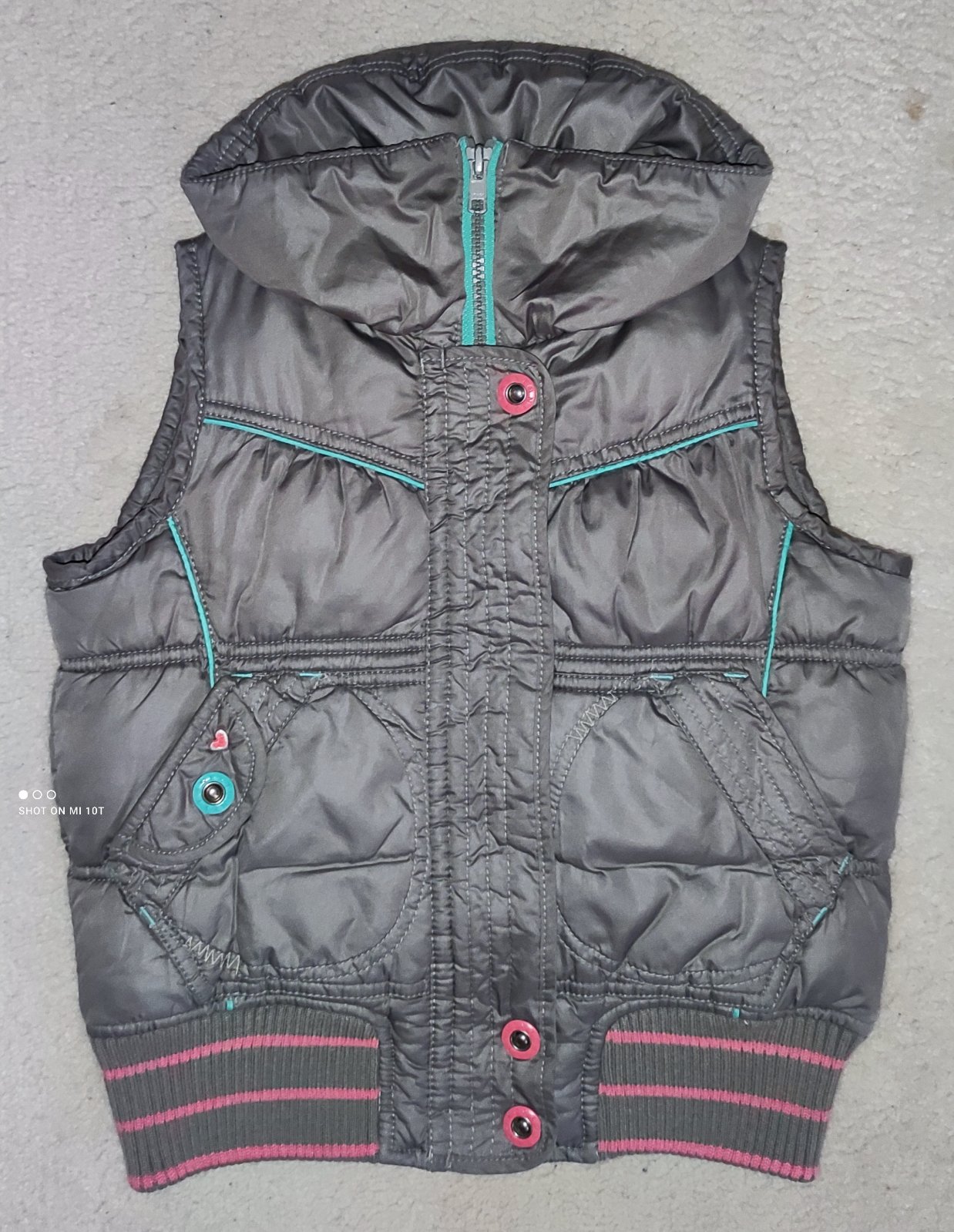 Tm. šedo-stříbrná vesta po dceři. Má límec, zapínání na zip a přes něj je klopa na patentky. Má dvě kapsy. Podšívka fleesová. Super na ven, není na ní vidět špína. Vel. 5-6 let, 116 cm. Možnost osobního předání po Praze.