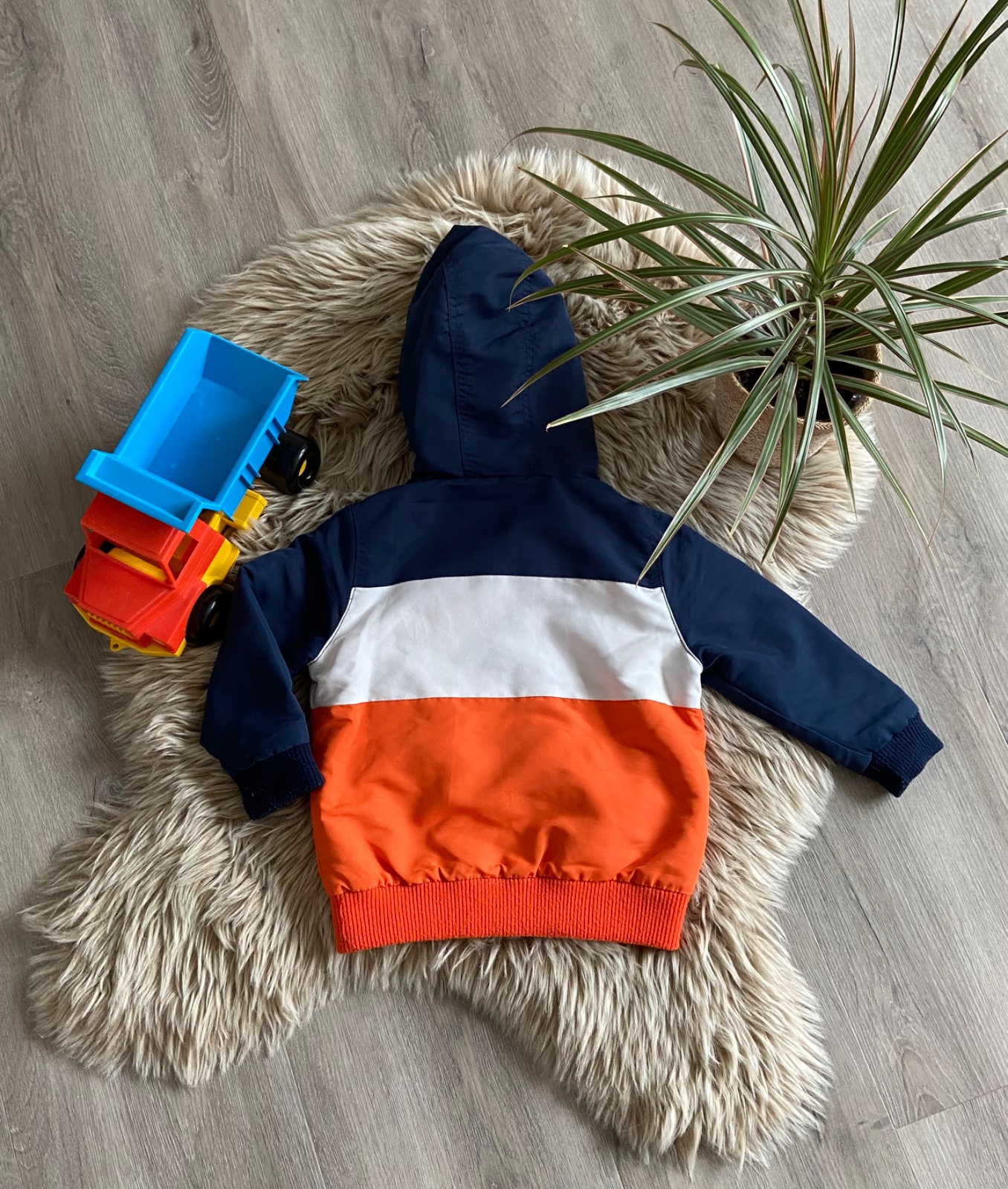 Bundička je v krásném stavu. Je tenčí, ale zateplená flisem. Jedna vada na bundičce je že na zadní straně ten reflexni prvek autíčko se začíná odlupovat.