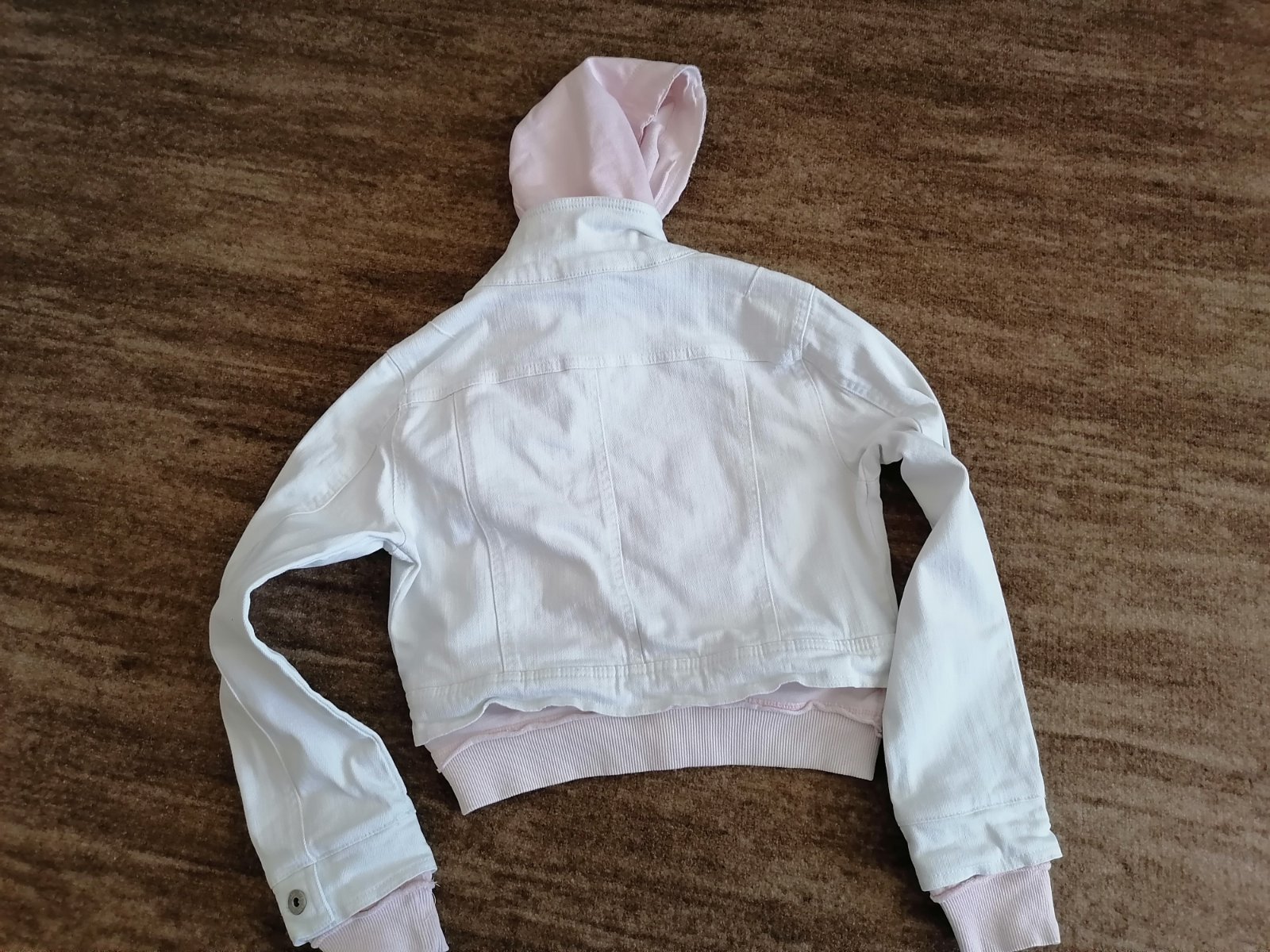 Délka 68cm rukáv od krku 62cm vč.manžety Kapuce na pevno Na rukávu pidi flíček Barva spíše smetanová Žmolek u zipu viz foto a na manžetách