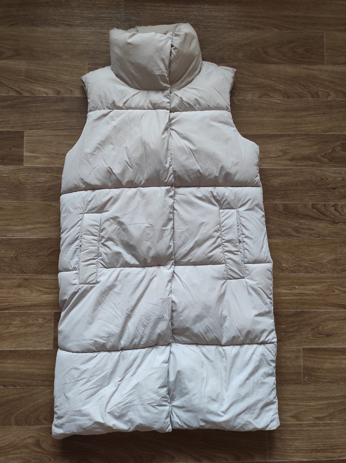 Černá naducaná prošívaná vesta, na bocích jsou šedé vlněné vsadky, teplá podšívka, kapuce napevno olemovaná kožíškem, kapsy, vesta se zapíná na zip, řekla bych že nošená tak max.2x, naprosto skvělý...