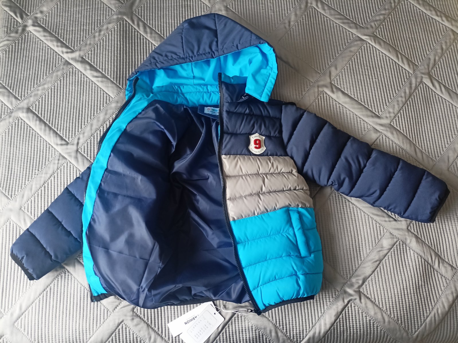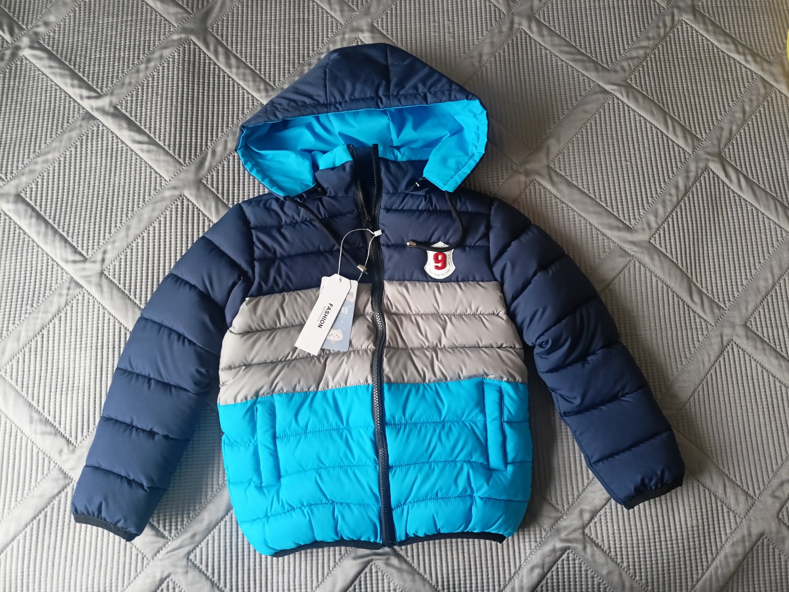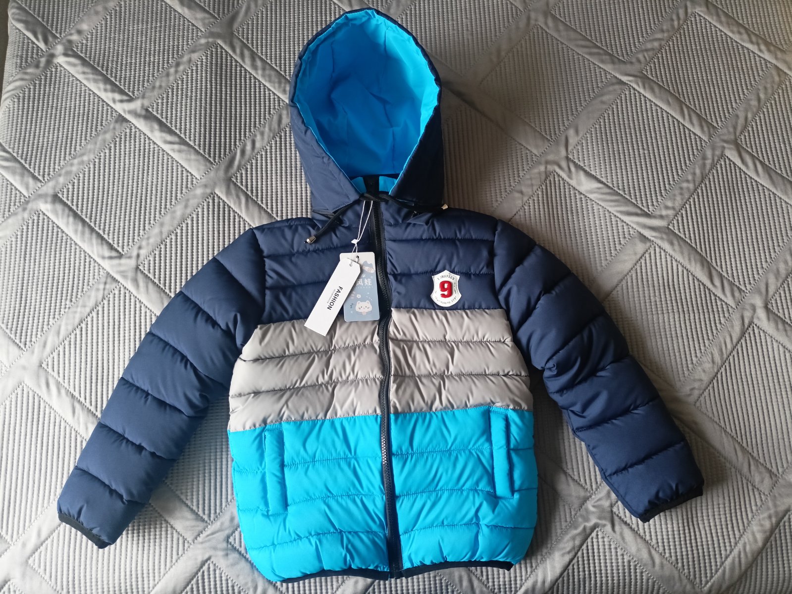 Nová, s visačkou. Originální prošívaná zimní bunda ve.128 s pruhovaným vzorem z potěší každého kluka. Bunda se stojáčkem a na zip odepínatelnou kapuci se stažením na olivku.