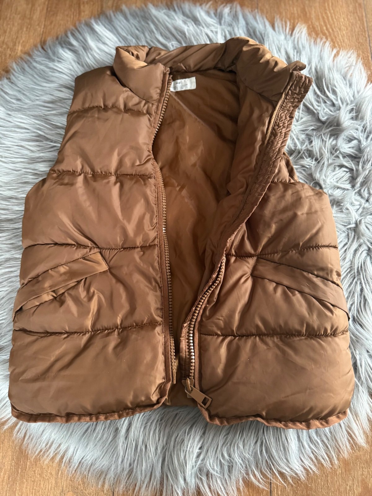 Krásně naducaná, skořicová vesta nošená krátce jedním dítětem, svrchní materiál polyester, uvnitř teplý fleec, mezivrstva vatelín, efekt vrstveného oblečení, vypodložená, tmavo modrá úpletová kapuc...