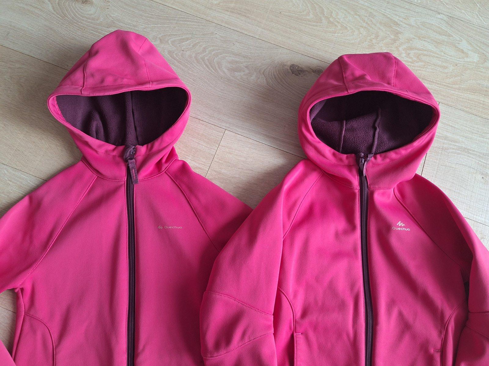 Sytě růžové softshelové bundičky podšité fialovým flísem. Značka Quechua vel cca 116 a menší je cca 110. Cena za jednu 150,- Kč