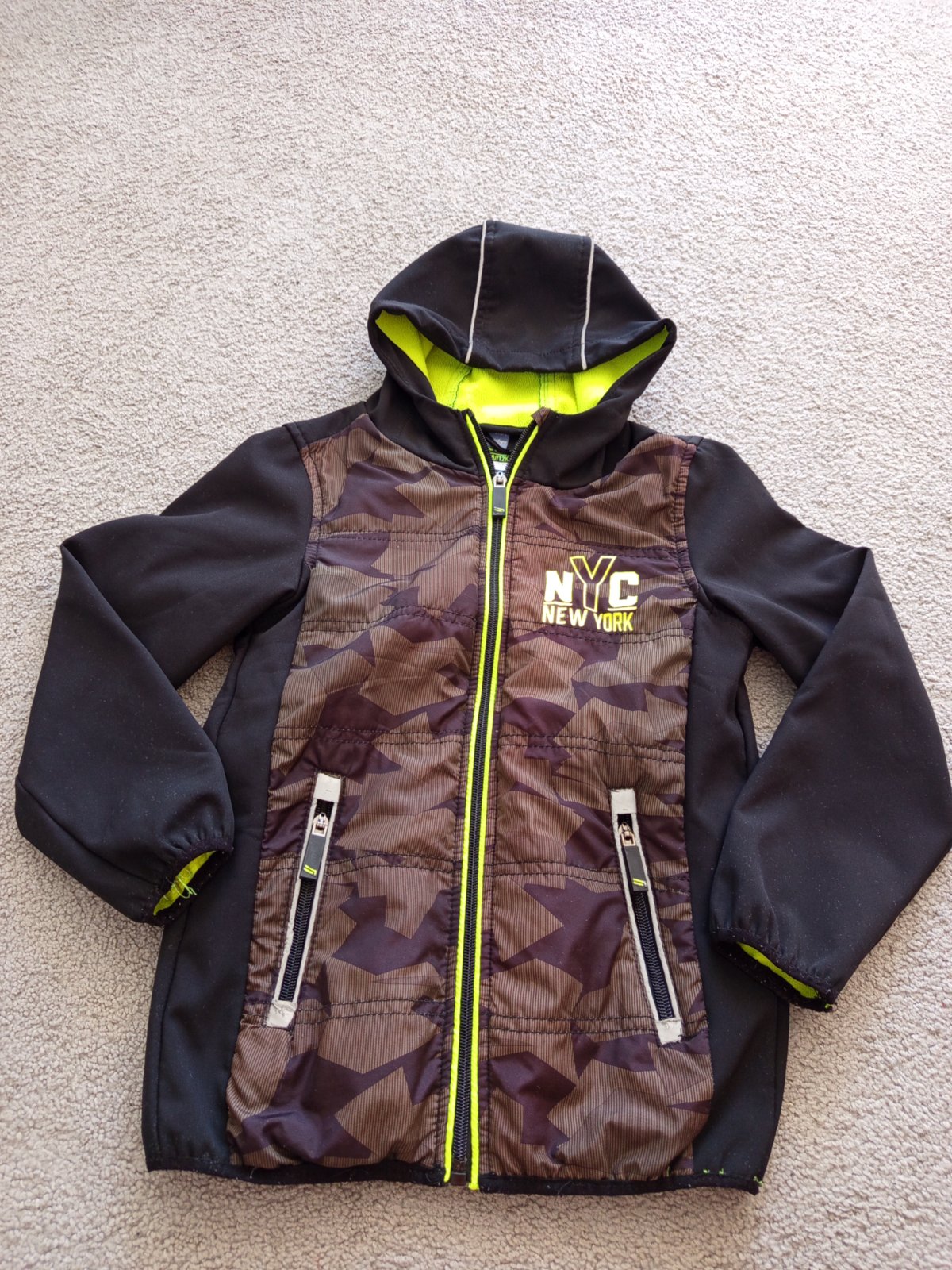 Šusťáková bunda s bavlněnou podšívkou zn. Dopodopo. Kapuce, kapsy na zip, reflexní značka na zádech. Málo nošená. Vel.128 D-52 cm š-40 cm r.od krku-55 cm