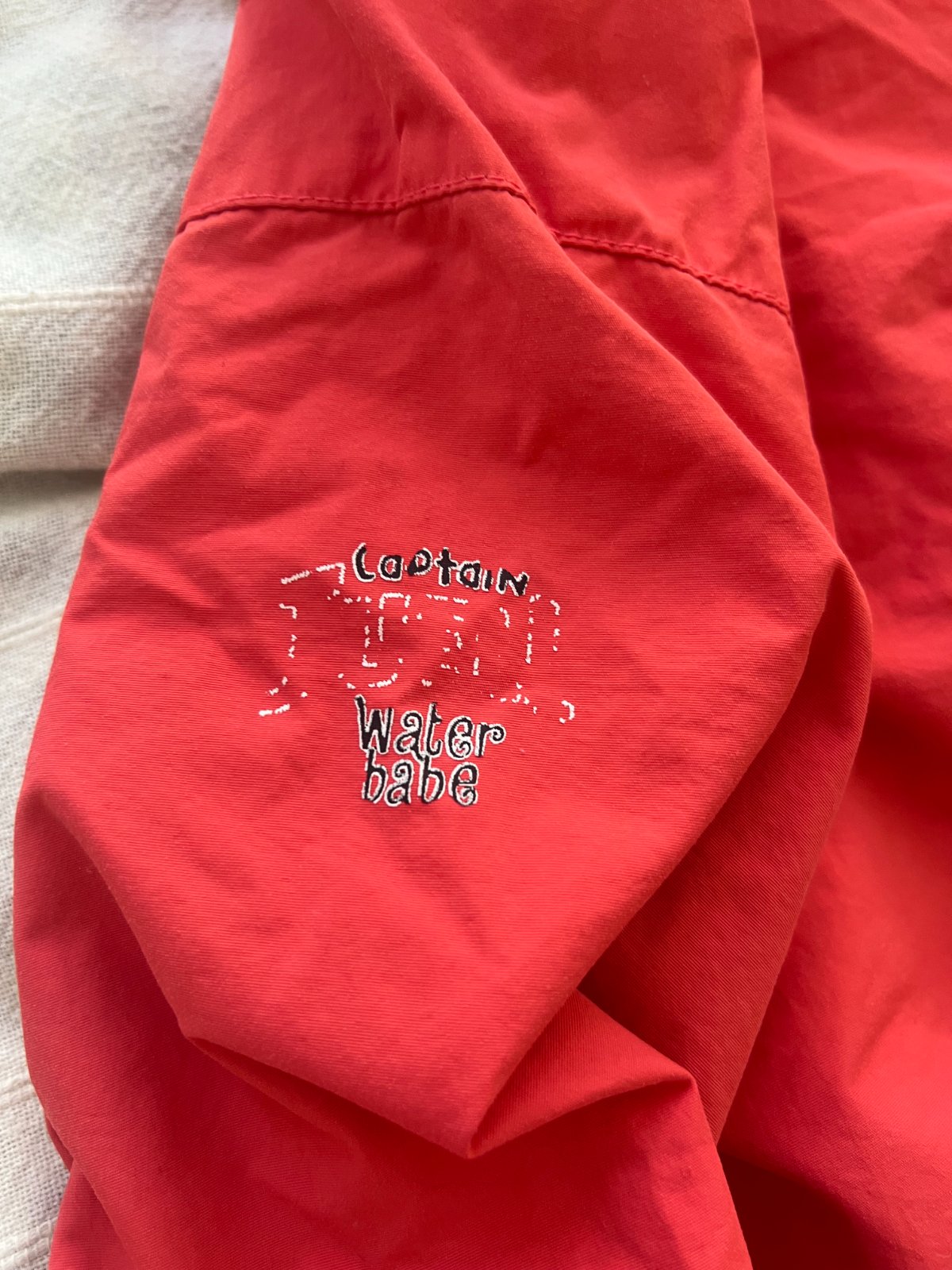 Světle červená, bez vad. Jen nápis na rukávu se již olupuje.