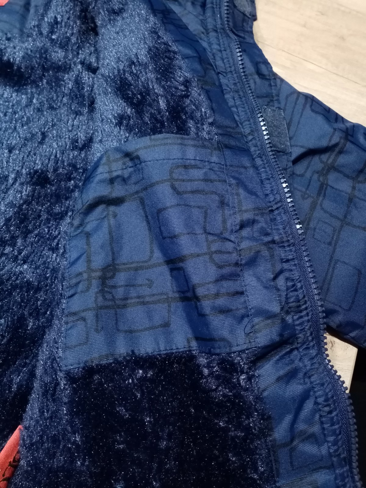 Přechodová bunda , spíše na mírnou zimu ,velikost uvedena 5-6 let, materiál 100%polyester,vyteplená vatelínem a podšívka 100%polyester,,kapuce odepínací, kapsy, rukávy a spodek do gumy reflexní prv...