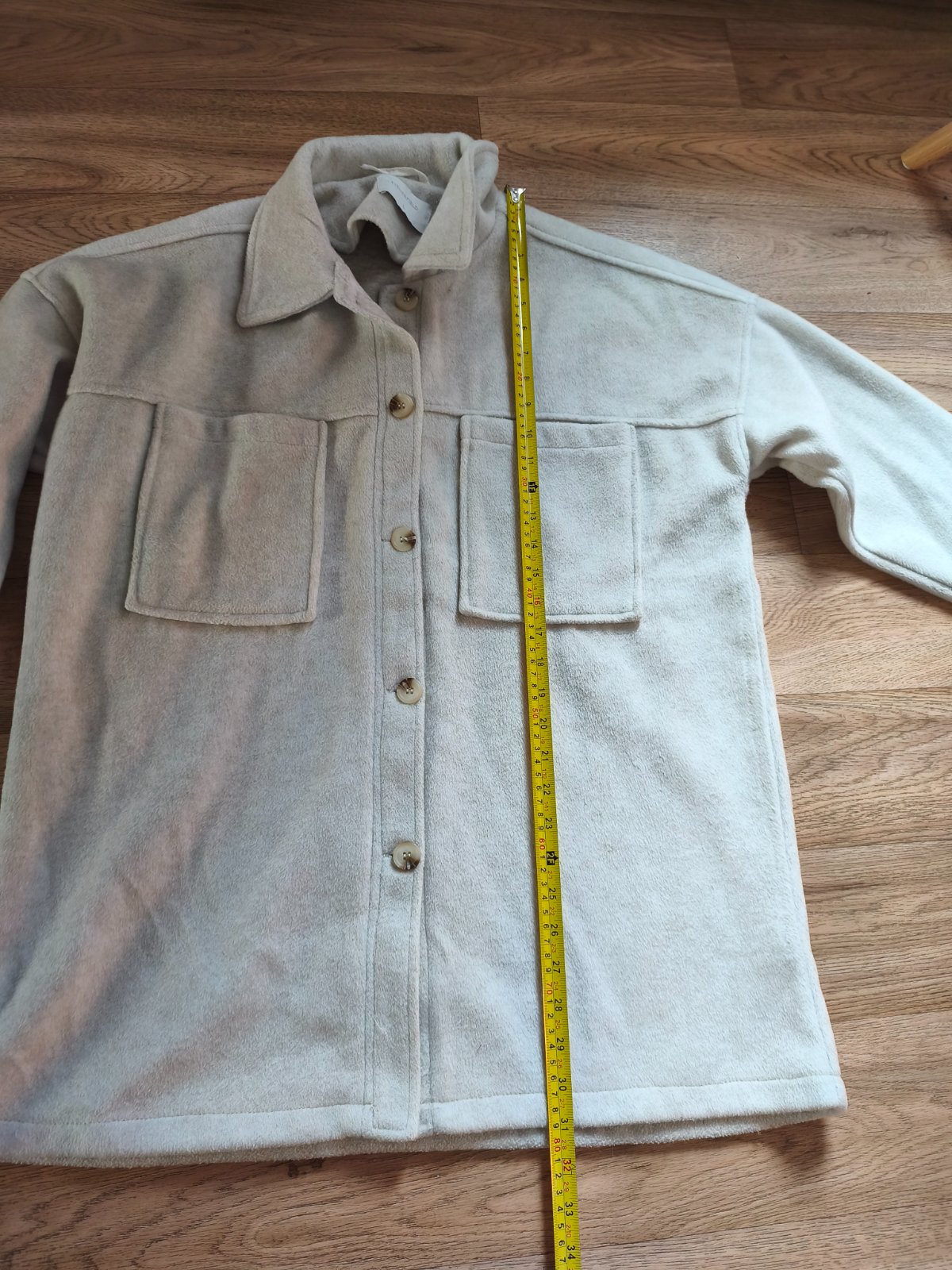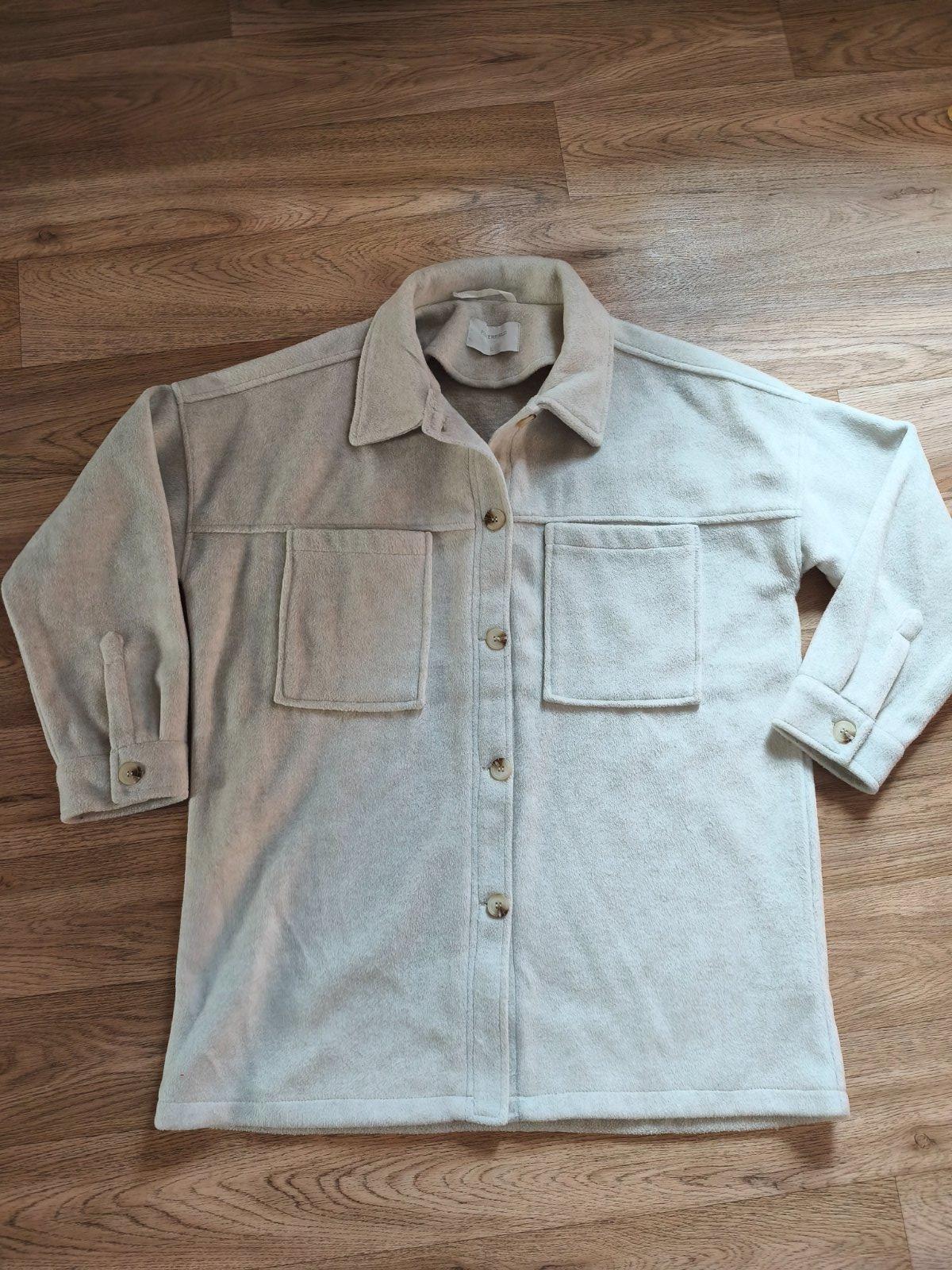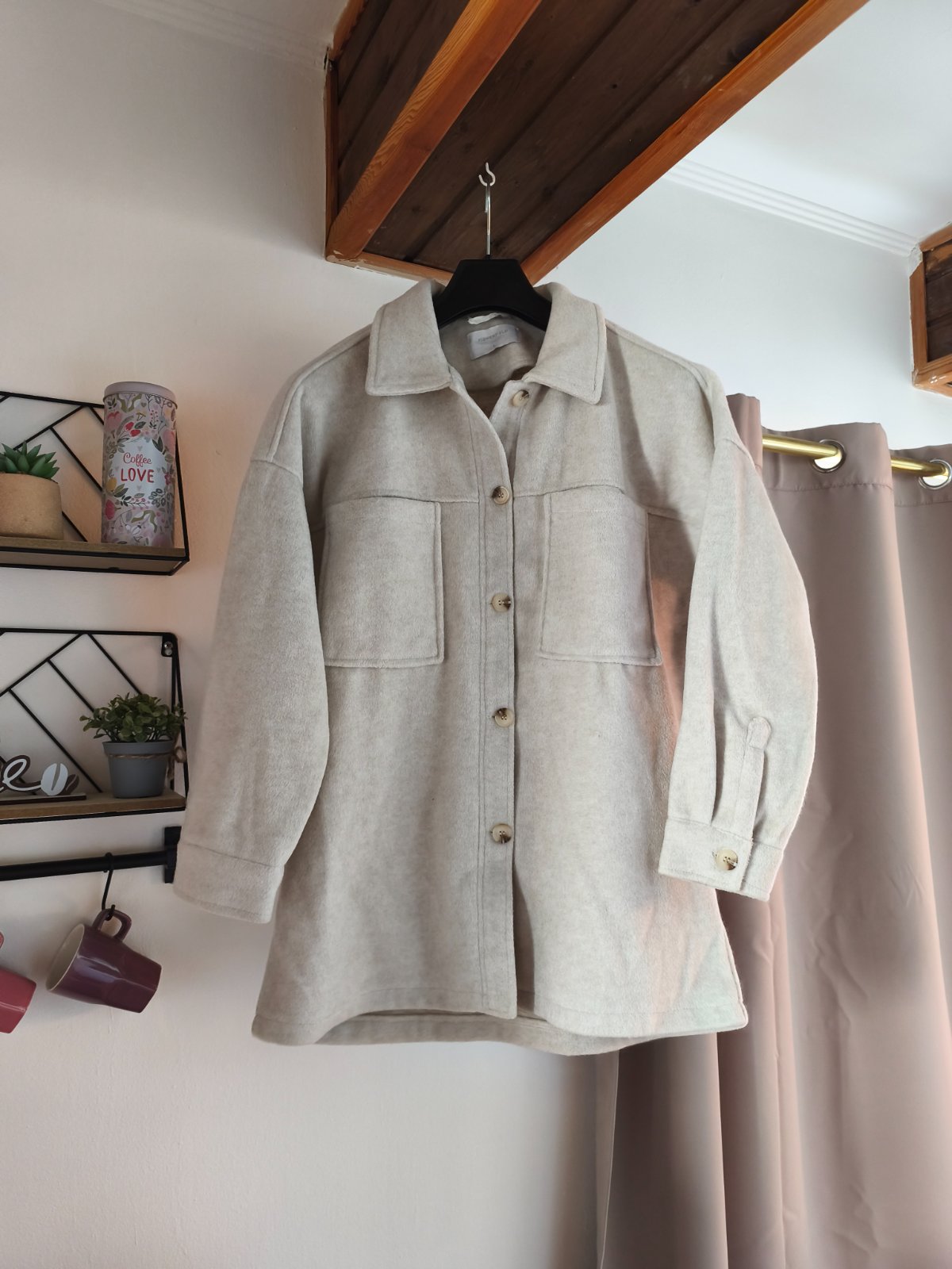 Krémová bundokošile, utrhlé poutko, běžné známky praní, žmolík, málo nošená. Skvěle vypadá i s páskem. Oversize L, měřte.