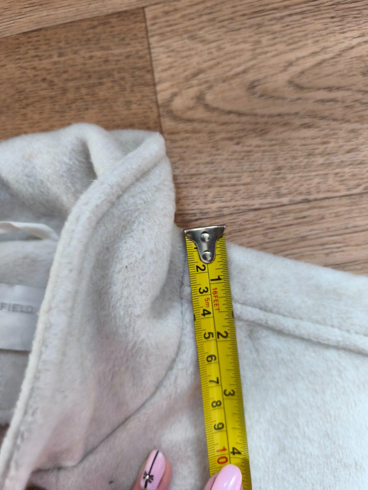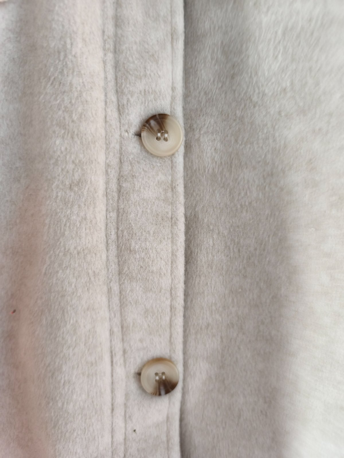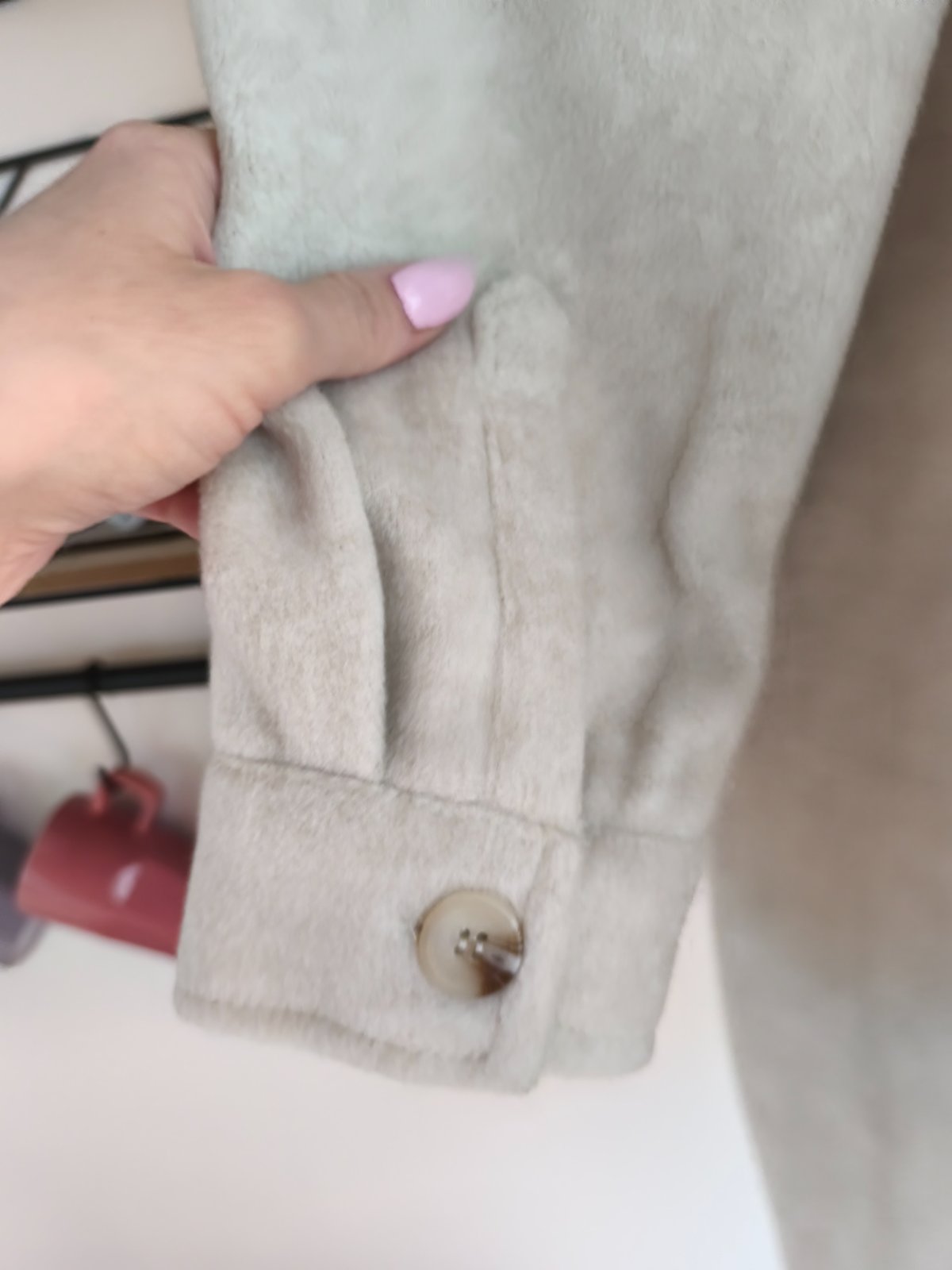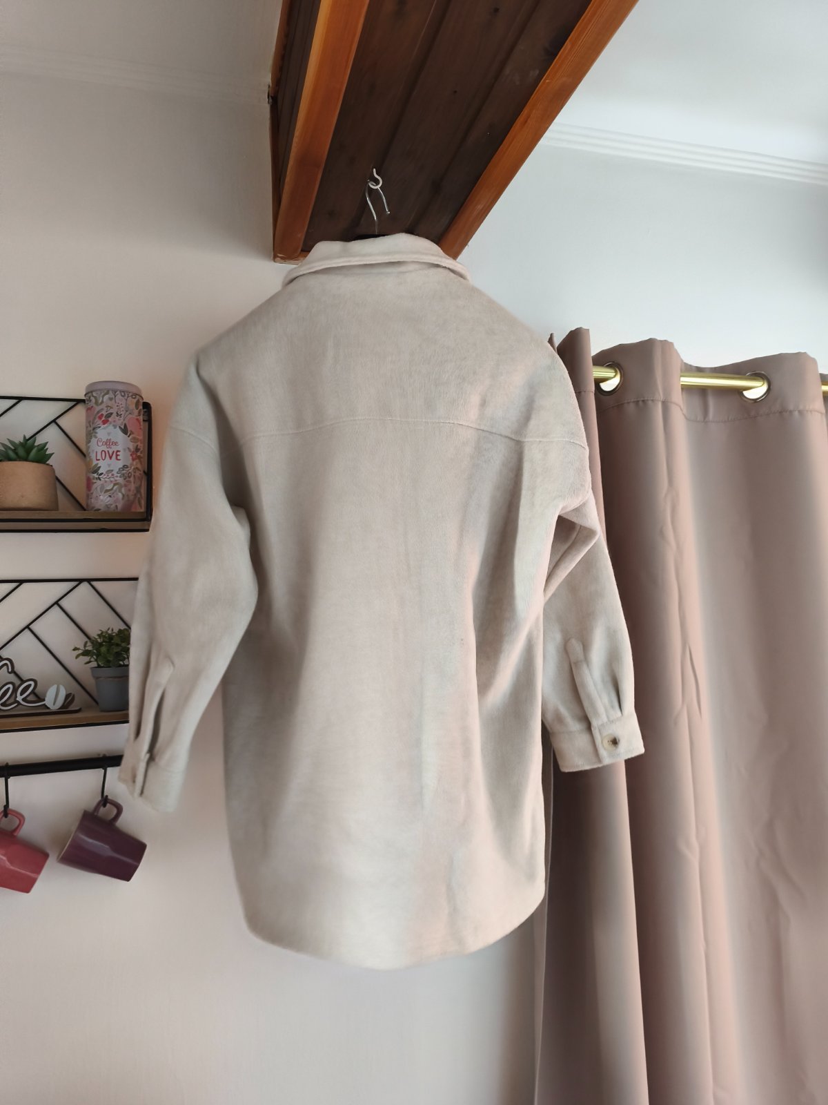 Krémová bundokošile, utrhlé poutko, běžné známky praní, žmolík, málo nošená. Skvěle vypadá i s páskem. Oversize L, měřte.