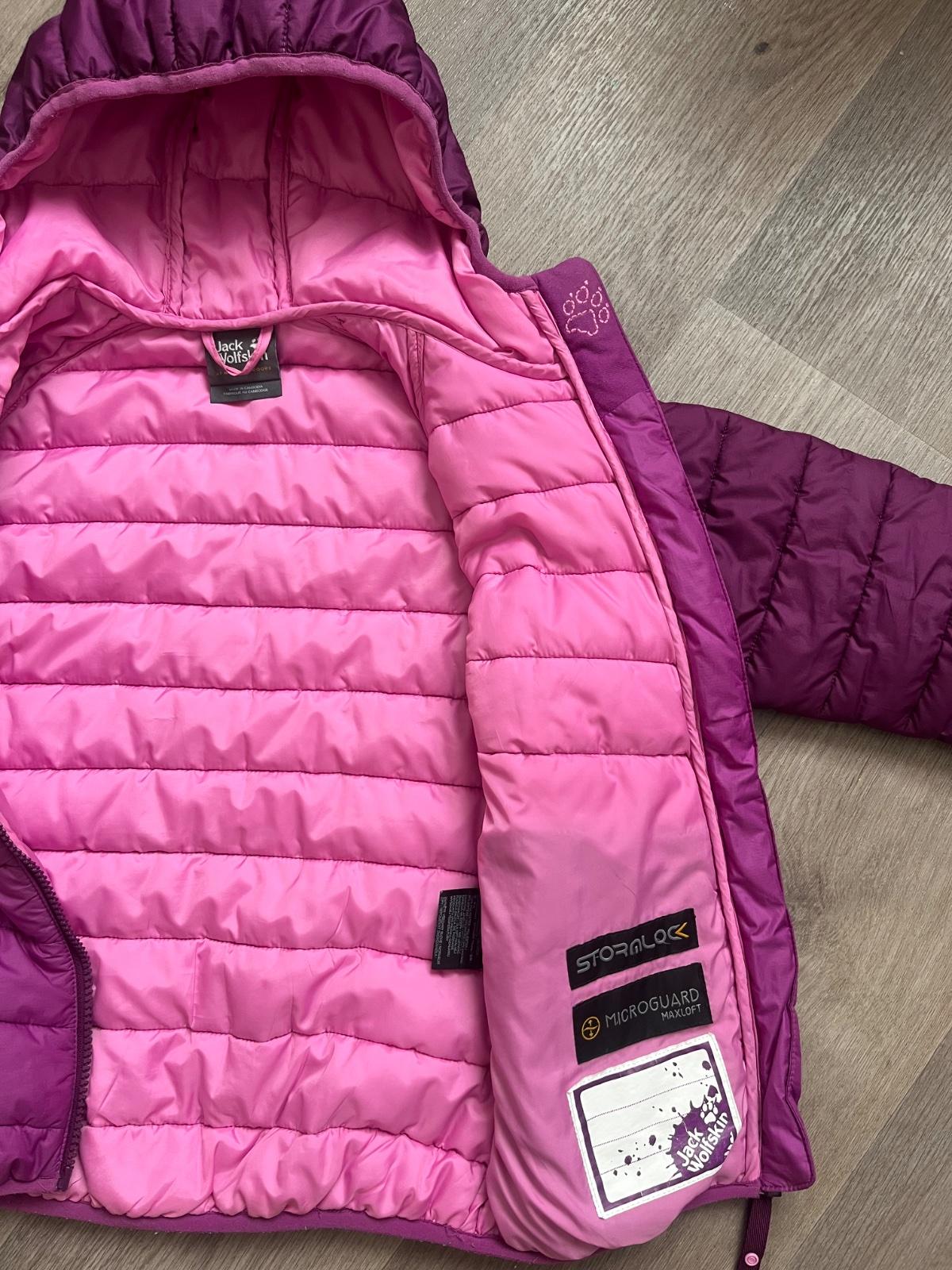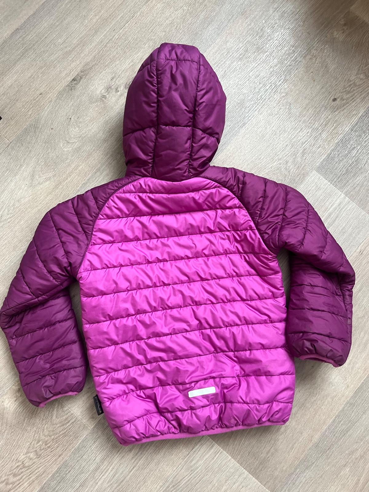 Nošená dívčí bunda s odepínací kapucí. Barva růžovo-vínová. Velikost 128. Délka 51 cm, šířka 42 cm, délka rukávu od krku 58 cm. Vpředu malinkatá dírka.