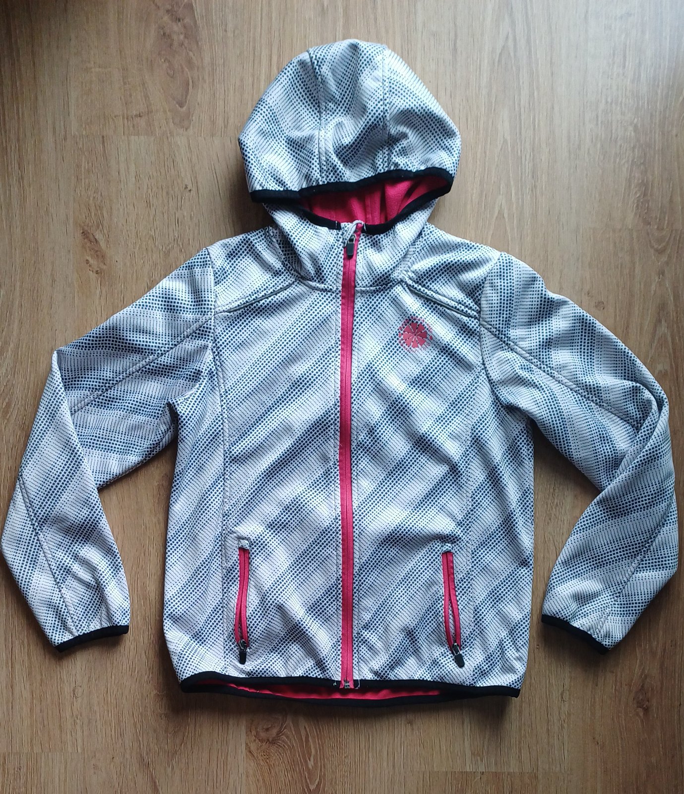 Moc pekna, bilo-seda. Mekky softshell. Uvnitr fleece. Delka od krku 53, sirka 43, rukav od krku 60, od ramene 53, vnitrni 40,5.