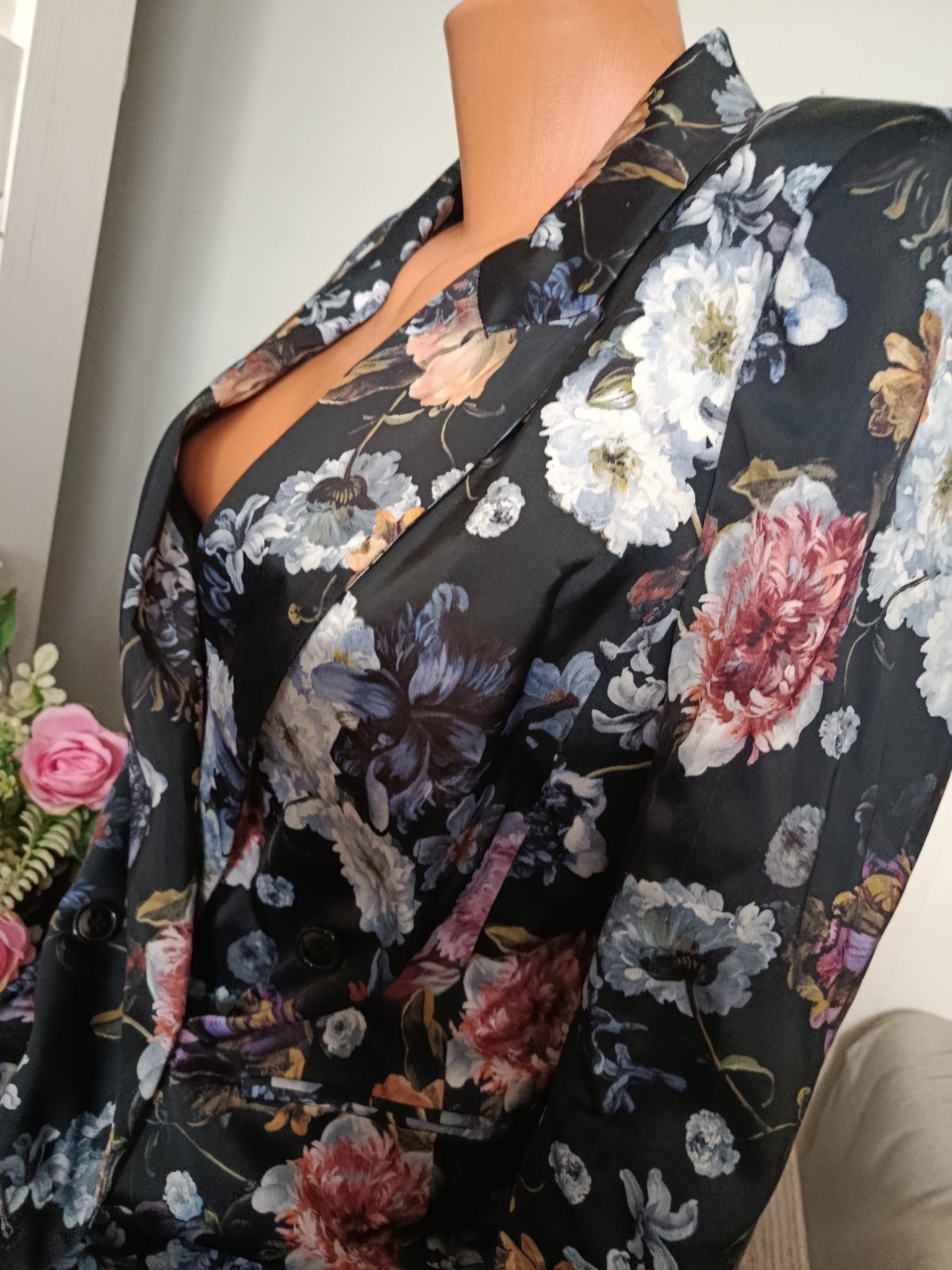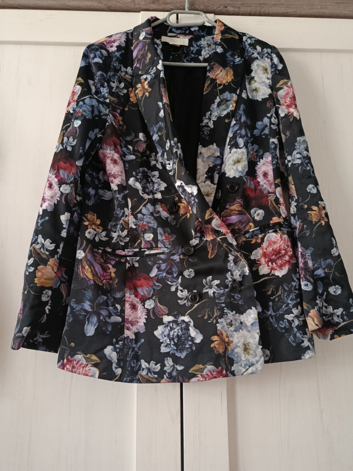 Krásné květované sako s černou podšívkou....Velké knoflíky, kapsy. Na rukávech jsou našité 3 knoflíčky ....Velice příjemný hladký materiál. Sako je v perfektním stavu....Míry : délka 68 cm, pas 2 x 46 cm, průramky 2 x 48 cm a délka rukávu od krku je 69 cm. Materiál : 98 % polyester a 2 % elastanu. Poštovné - balíkovna za 85 Kč nebo zásilkovnou za 90 Kč.