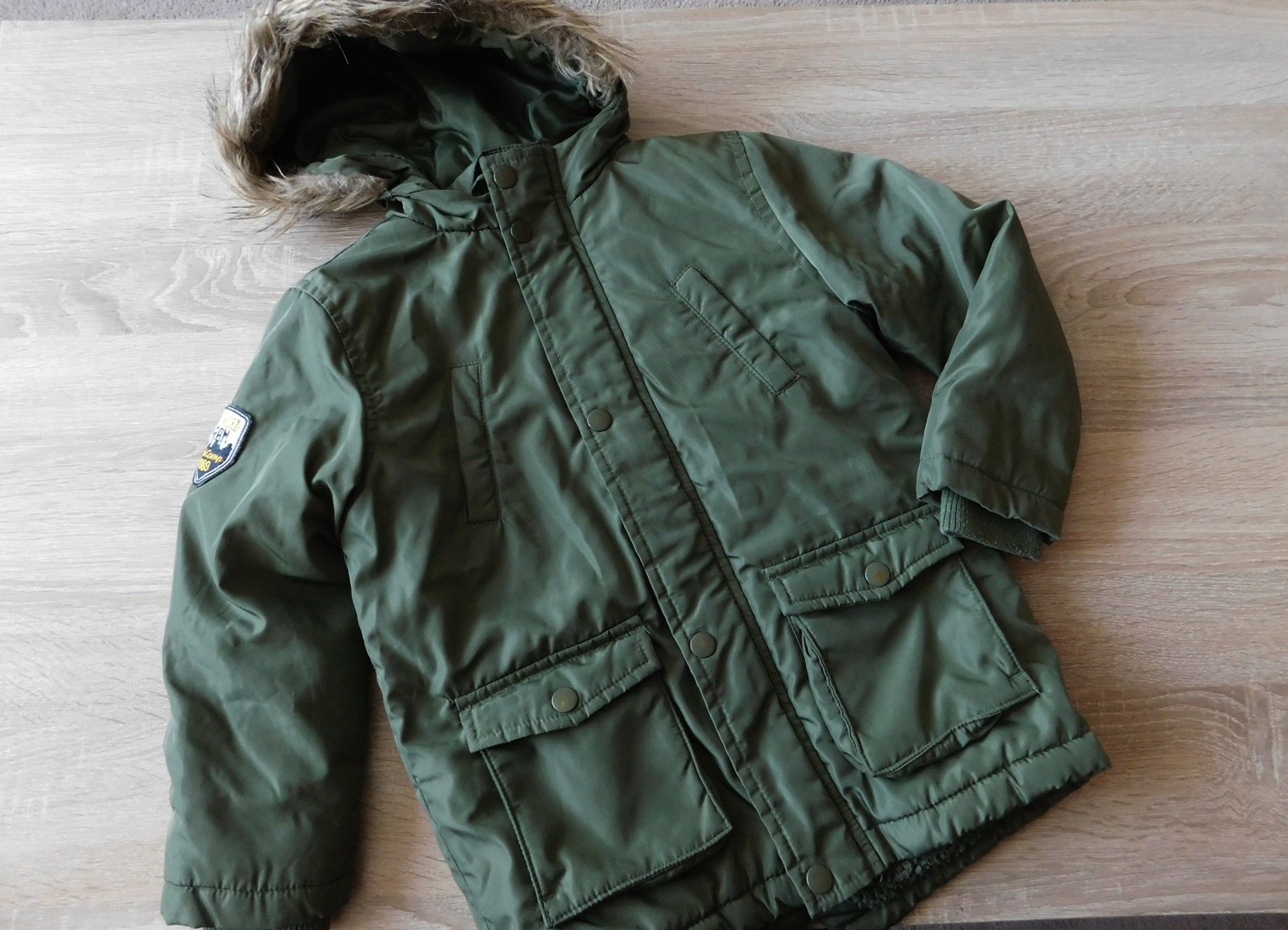 uvnitř teplá podšívka,kapucka,kapsy,náplety na rukávech,d.50cm,š.2x39cm,ruk.od krku 47cm,odřená barva z druků na kapsách