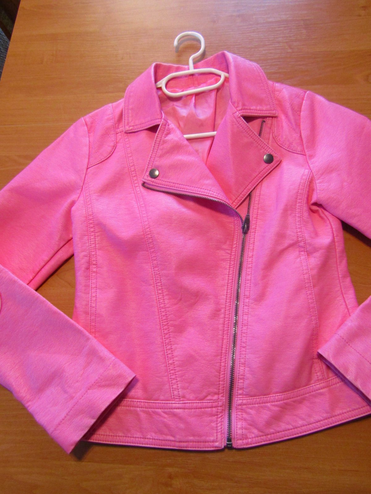 růžová koženková bundička stále super stav šířka 42 cm délka 53 cm délka rukávu od krku 70 cm