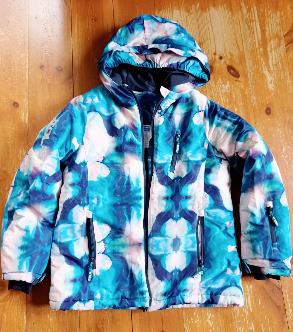 Dívčí lyžařská bunda Coccodrillo, mnou kupovaná, nošená jednu sezonu, bez vad. V rukávech černá léga s otvorem na palec, pás proti sněhu, hodně kapes, kapsa na rukávu na permici.