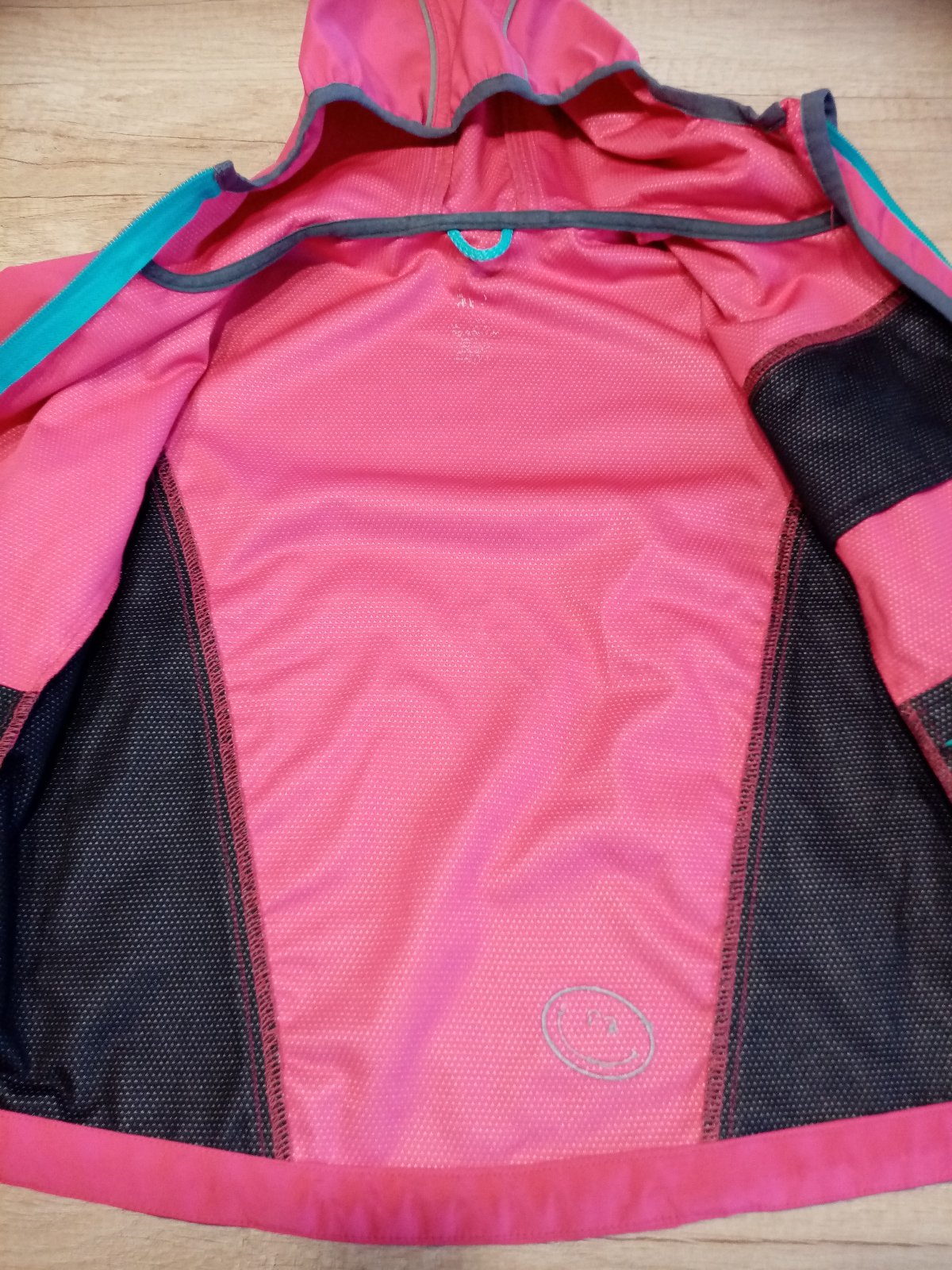 starší bunda, už spíše do školky nebo na lítačku, malý flíček zespodu rukávu, jiné vady nemá záda cd 36, rukáv od kapuce 47cm