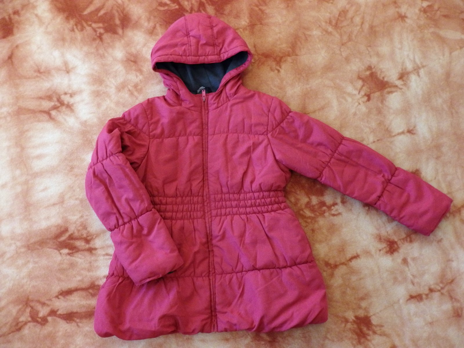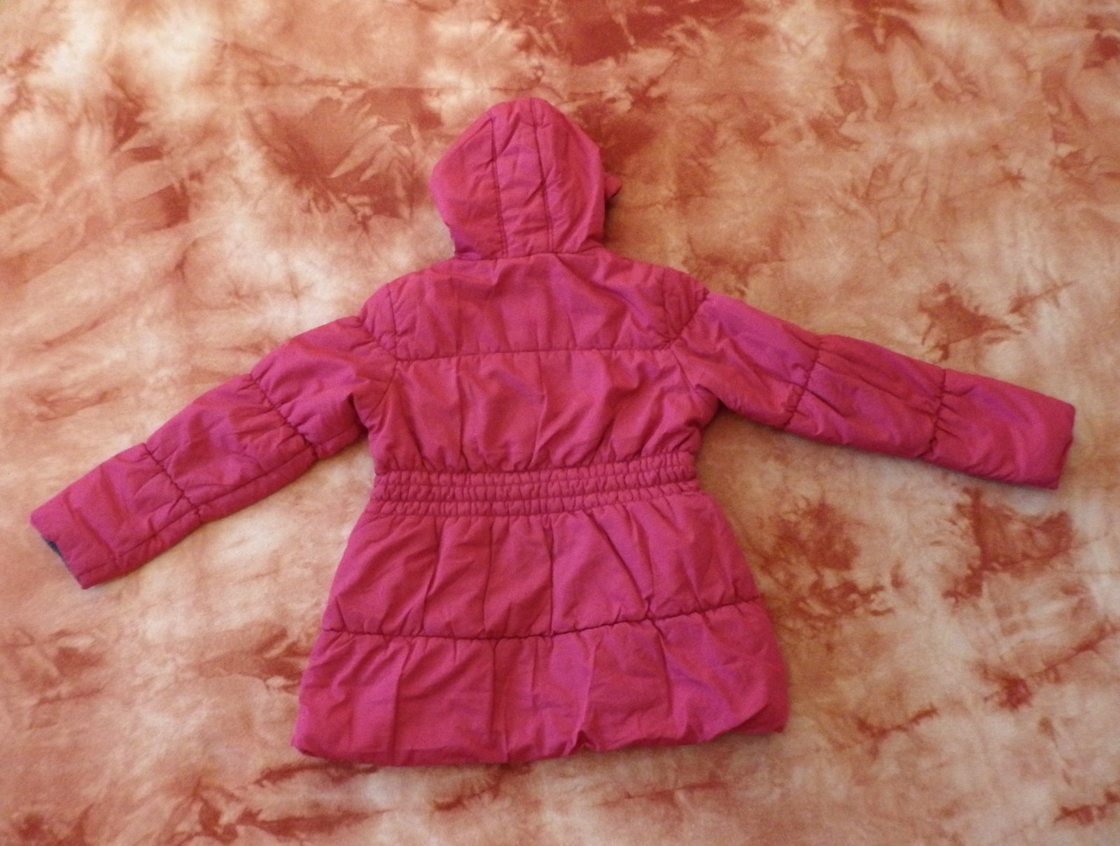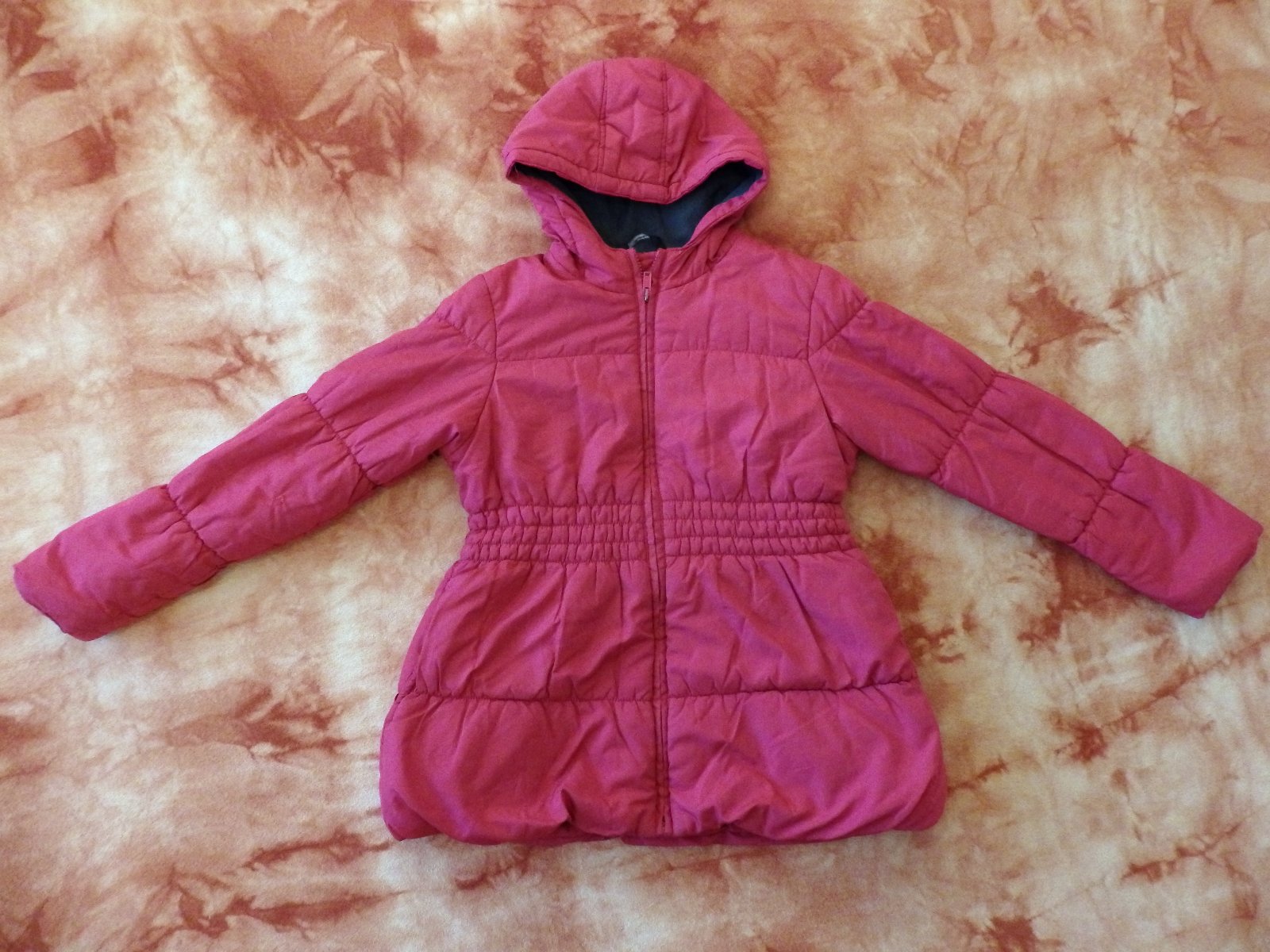 Pěkný červený kabátek - zimní bundička George, velikost 140. Na obou rukávech zašité malé dírky. Jinak v dobrém stavu. S kapucou, dvě kapsy, zapínání na zip. Příjemně se nosí.